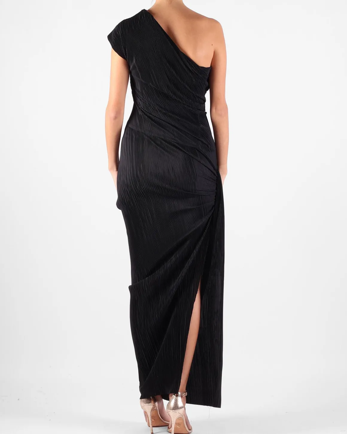 Deze lange zwarte jurk met één schouder is een gedurfde en verfijnde keuze voor een elegante look. Het geplooide detail bij de schouder en taille voegt een speelse maar toch verfijnde uitstraling toe, terwijl de strakke, getailleerde pasvorm het vrouwelijke silhouet mooi benadrukt. Het ontwerp met één schouder zorgt voor een moderne en chique twist, perfect voor zowel formele als avondgelegenheden. De zwarte kleur maakt de jurk tijdloos en veelzijdig, en het is gemakkelijk te combineren met minimalistische accessoires voor een verfijnde uitstraling.