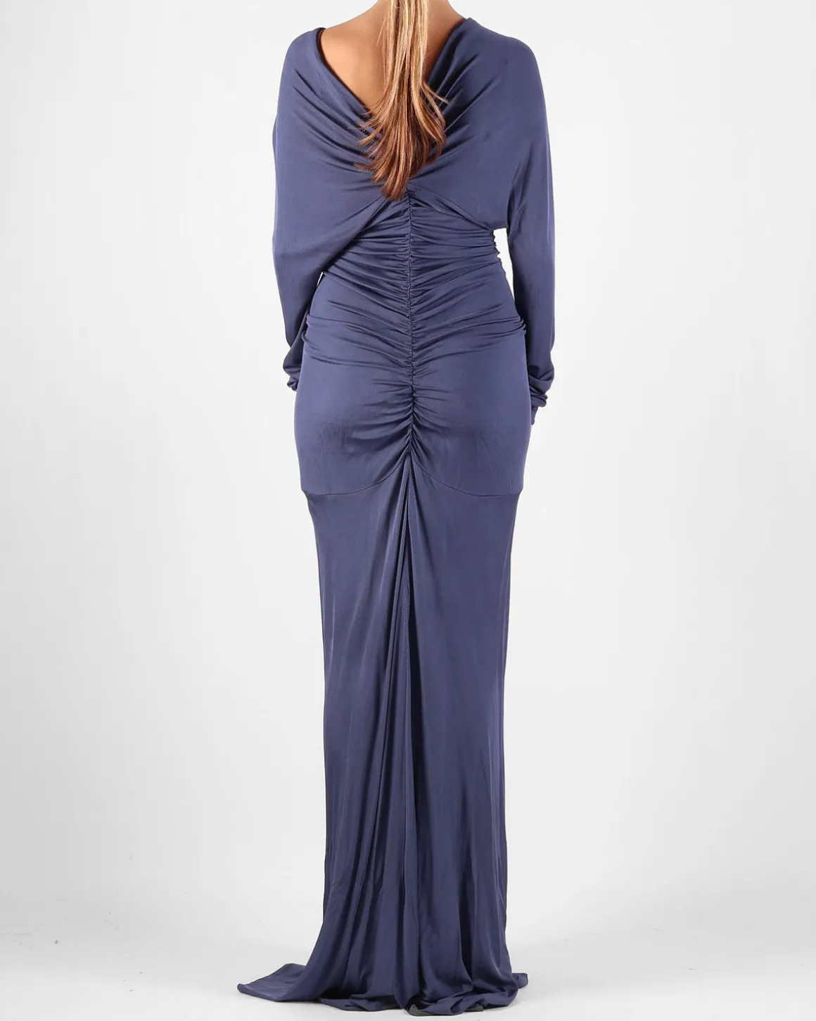 Deze off-shoulder blauwe jurk van Atlein is een statement stuk dat moeiteloos de aandacht trekt. Het ontwerp straalt elegantie en verfijning uit, met een draperende en vloeiende stof die een adembenemend effect creëert, perfect voor feesten en speciale gelegenheden. De jurk is subtiel getailleerd bij de heupen, waardoor het vrouwelijke silhouet op een flatterende manier wordt benadrukt. De ruches aan de voorkant en achterkant voegen een uniek dynamisch element toe, terwijl het off-shoulder ontwerp een moderne en sensuele twist geeft. De lange, vloeiende stof valt prachtig op de vloer en creëert een luxe, gracieuze uitstraling die bij elke stap elegant meebeweegt. De rijke blauwe kleur maakt het een verbluffende keuze voor elke speciale gelegenheid, waar je zeker opvalt met een verfijnde maar gedurfde look.