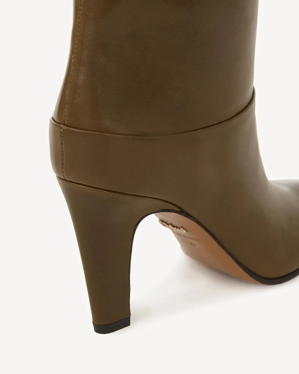 Deze khaki hoge laarzen van Chloé combineren een eigentijdse stijl met verfijnde elegantie, vervaardigd van luxueuze materialen. Het slanke, kniehoge ontwerp met een stevige hak biedt zowel comfort als een stijlvolle lift, waardoor ze perfect zijn voor dagelijks gebruik of speciale gelegenheden. De unieke khaki kleur voegt een moderne twist toe en maakt deze laarzen tot een opvallend en veelzijdig accessoire.