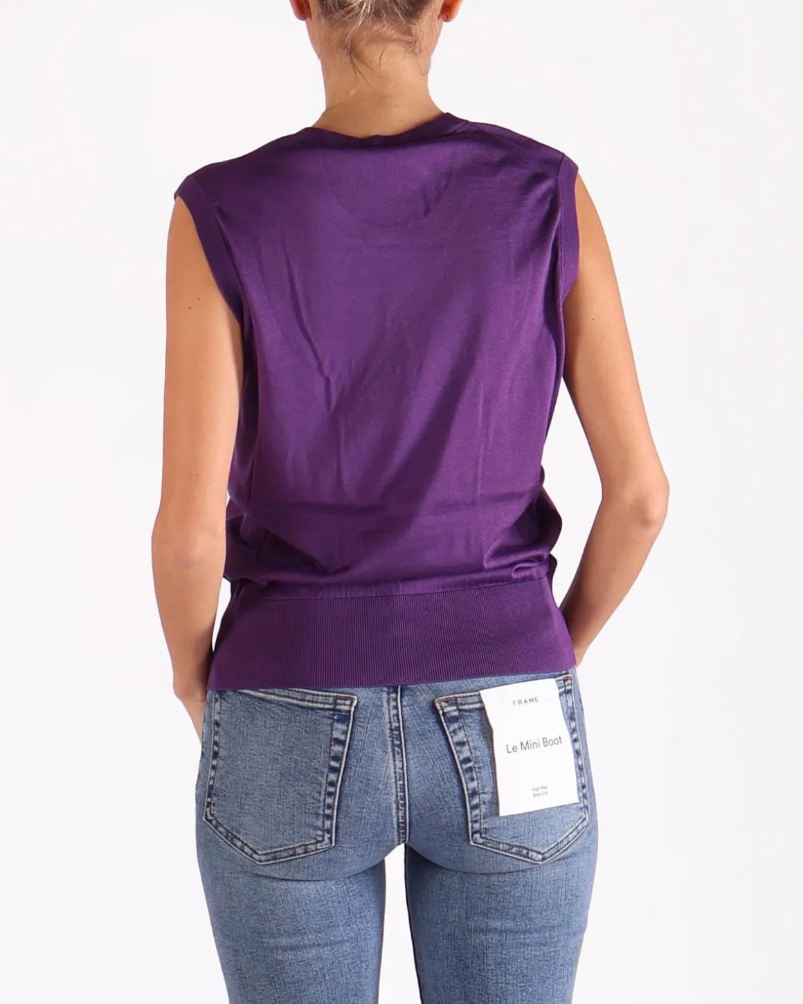 Deze mouwloze paarse zijden top van Dolce & Gabbana combineert luxe met elegantie. Gemaakt van hoogwaardige zijde, biedt het een soepele, ademende feel die perfect is voor warmere dagen. Het slanke ontwerp en de rijke kleur maken het een veelzijdig stuk, ideaal voor zowel casual als avondkleding.