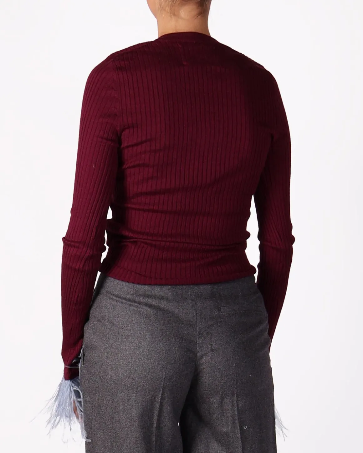 Deze bordeauxrode top van DoubleJ is een stijlvolle keuze, met verfijnde veerdetails aan de mouwen die een speelse en luxe touch geven. De rijke kleur voegt warmte toe aan je outfit en maakt het perfect voor zowel casual als feestelijke gelegenheden. Dankzij het unieke ontwerp en de comfortabele pasvorm is deze top een opvallend en modieus statement in je garderobe.