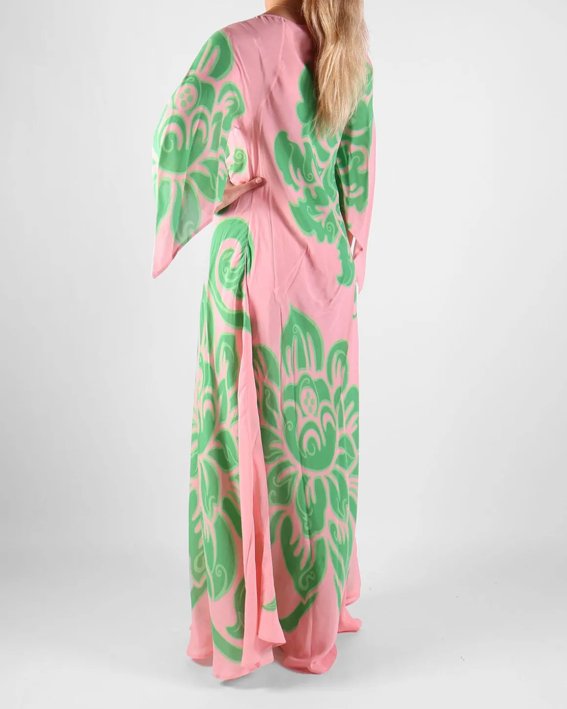 Deze lange Etro jurk in maat 44 heeft een gedurfde paisley print in roze en groen, perfect voor een feestelijke gelegenheid. De gedrapeerde mouwen zorgen voor een elegante uitstraling en de luchtige stof valt prachtig. Het levendige patroon maakt de jurk een echte blikvanger, ideaal voor vakanties of speciale momenten. Het is de perfecte balans tussen stijl en comfort.
