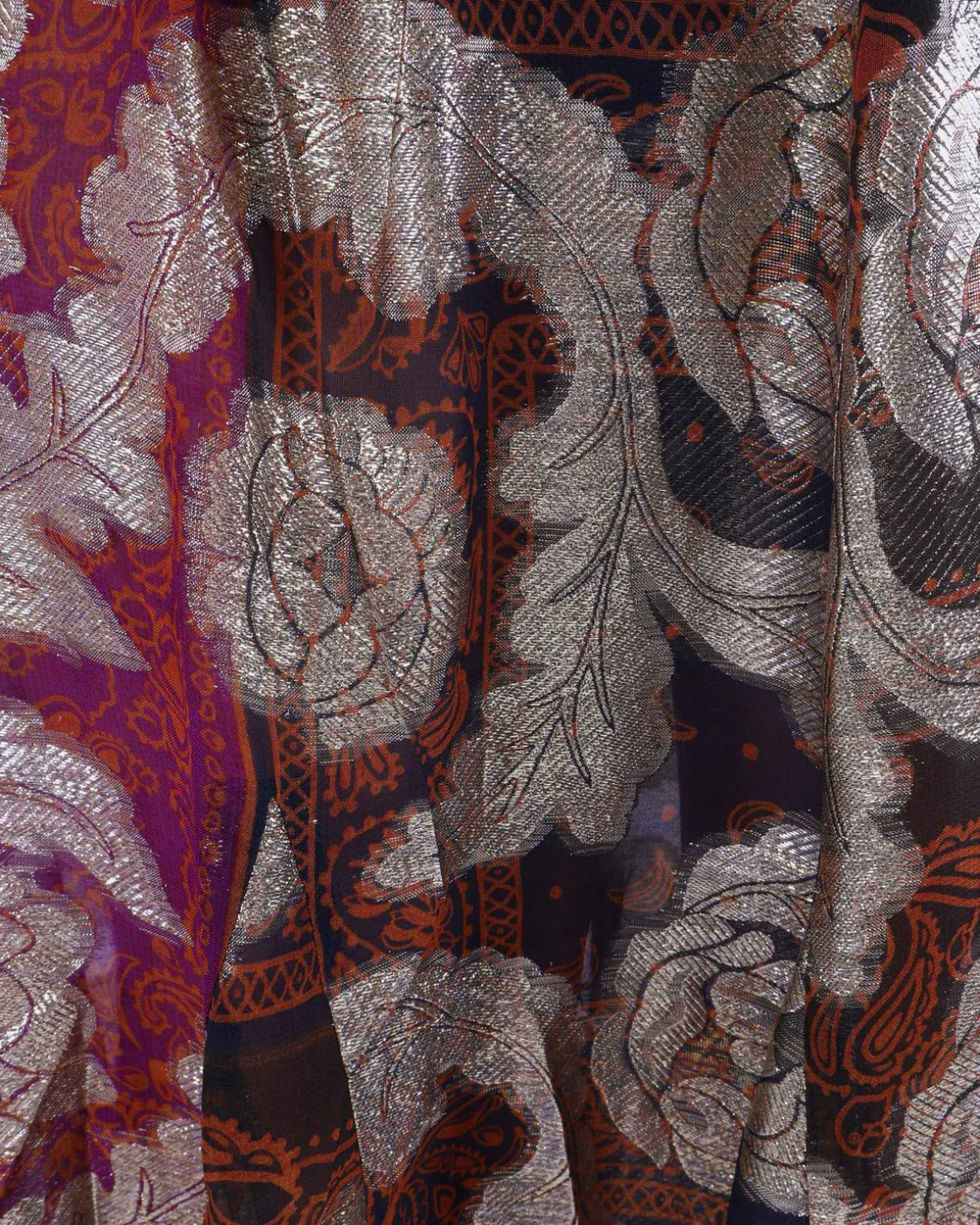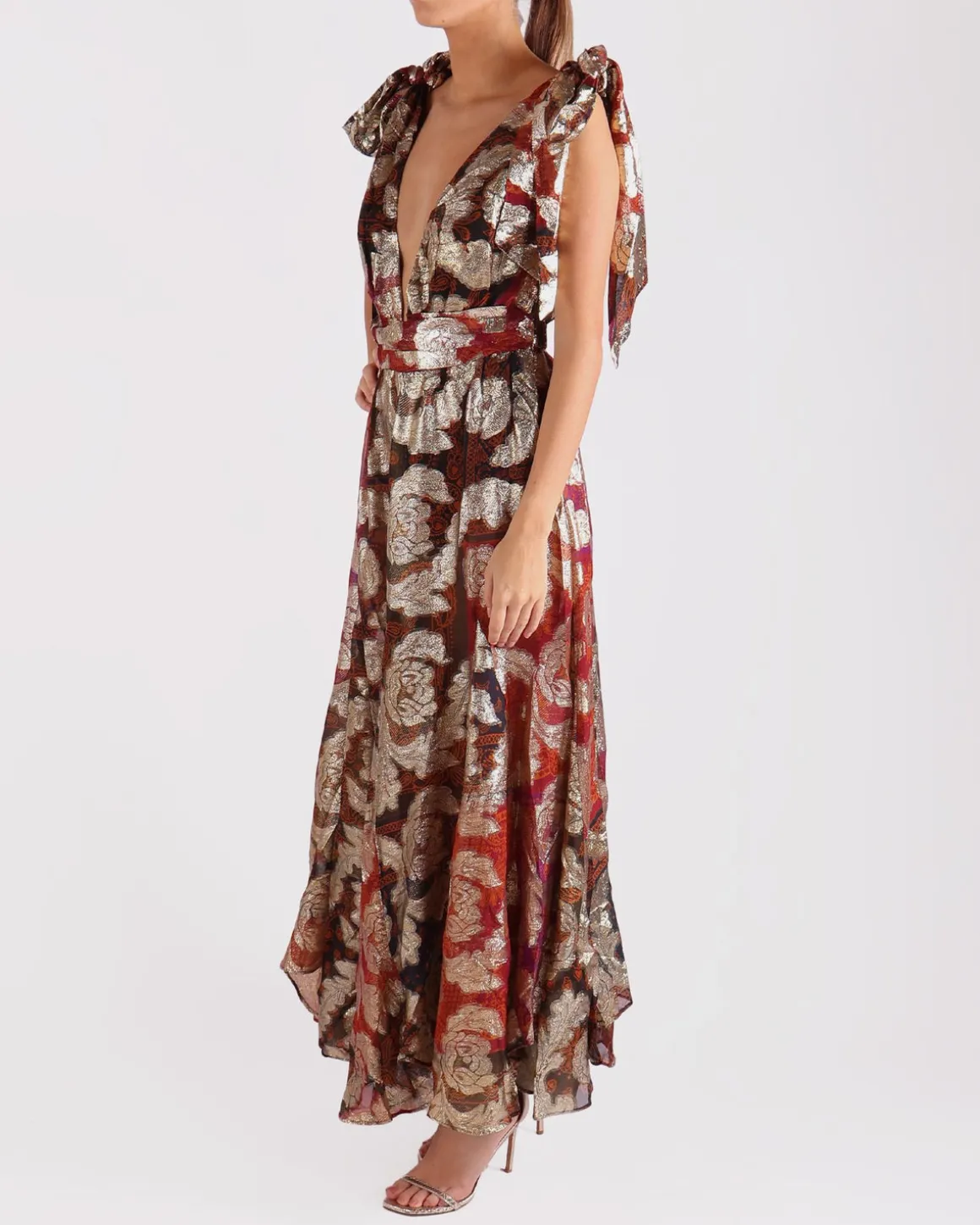 Deze maxi-jurk van Farmrio combineert levendige prints met elegante gouden details voor een opvallende en luxe uitstraling. De jurk valt vloeiend tot op de enkels en creëert een luchtig en vrouwelijk silhouet, perfect voor zomerse avonden of feestelijke gelegenheden. De subtiele glans van de gouden accenten voegt een vleugje glamour toe aan de kleurrijke en speelse print, typisch voor Farmrio’s unieke stijl.