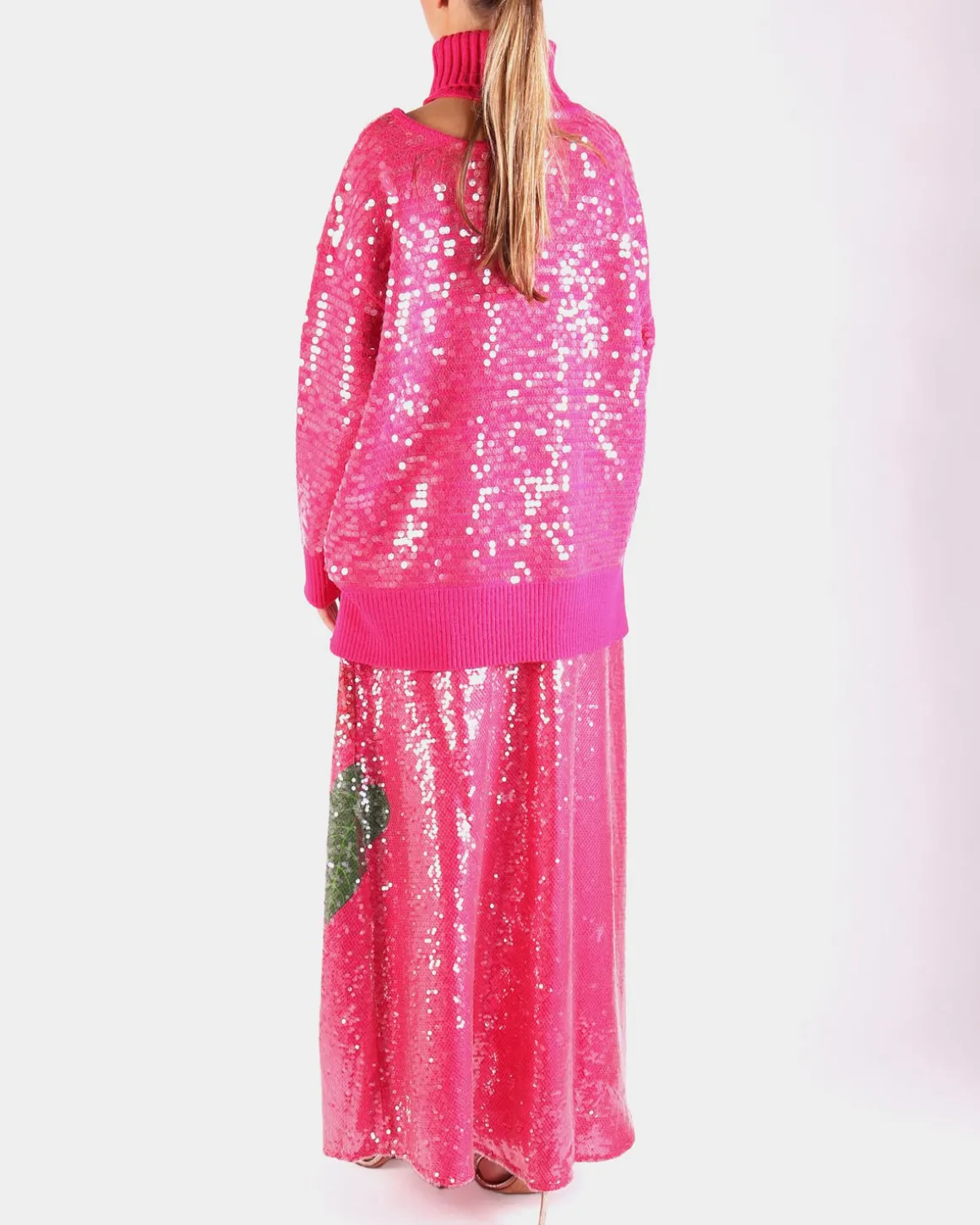 Deze roze sweater van Farmrio is een opvallend en modieus statementstuk. Voorzien van een col, sprankelende pailletten en een levendige print, combineert het comfort met een speelse, luxe uitstraling. Perfect om een vleugje kleur en flair toe te voegen aan je wintergarderobe.