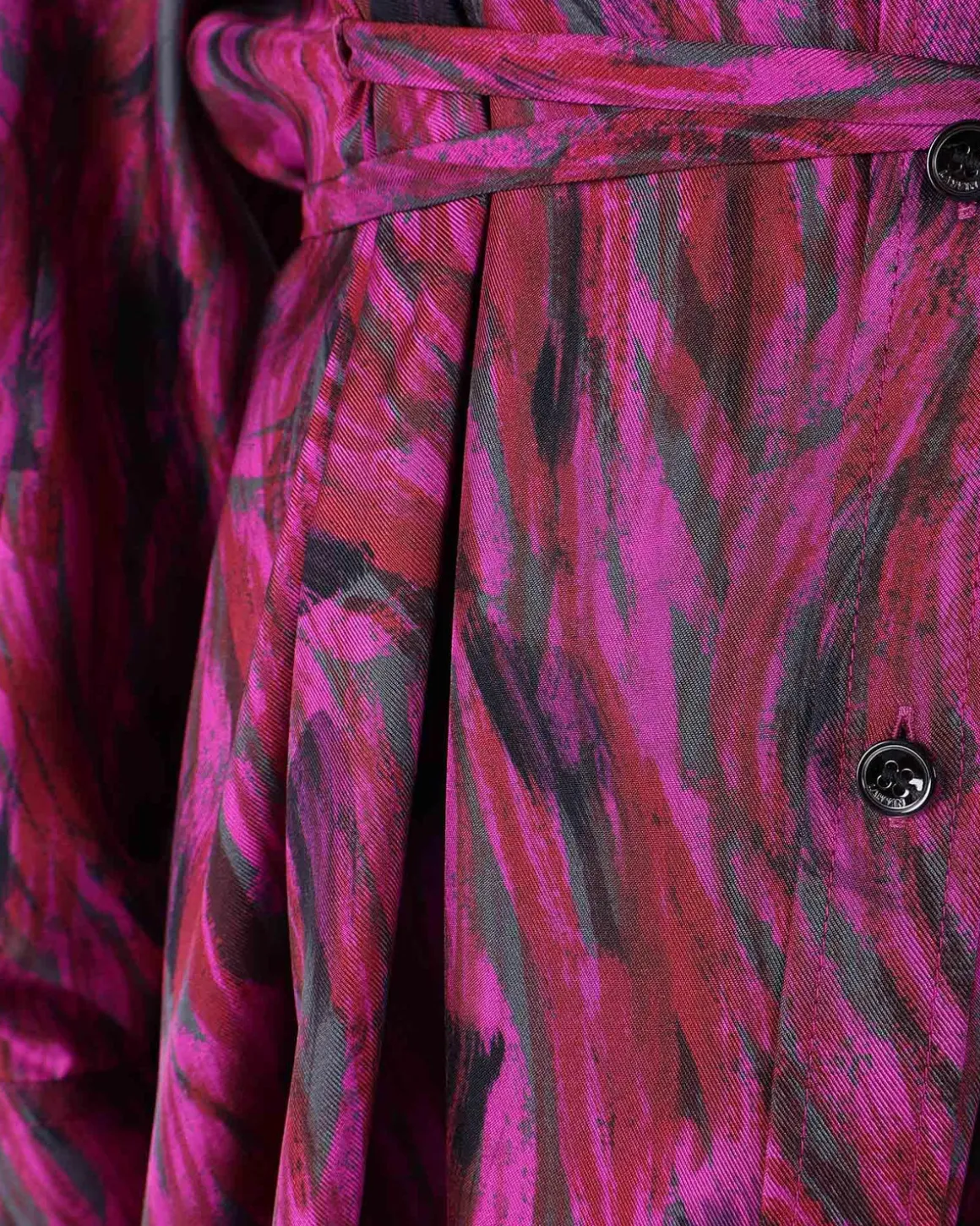 Deze lange fuchsia jurk van Lanvin is een opvallend mode-item met een gedurfde print die direct in het oog springt. Voorzien van lange mouwen en een elegante knoopsluiting, combineert de jurk klassieke elementen met een moderne flair. De bijpassende ceintuur accentueert de taille en zorgt voor een vrouwelijke, flatterende pasvorm.