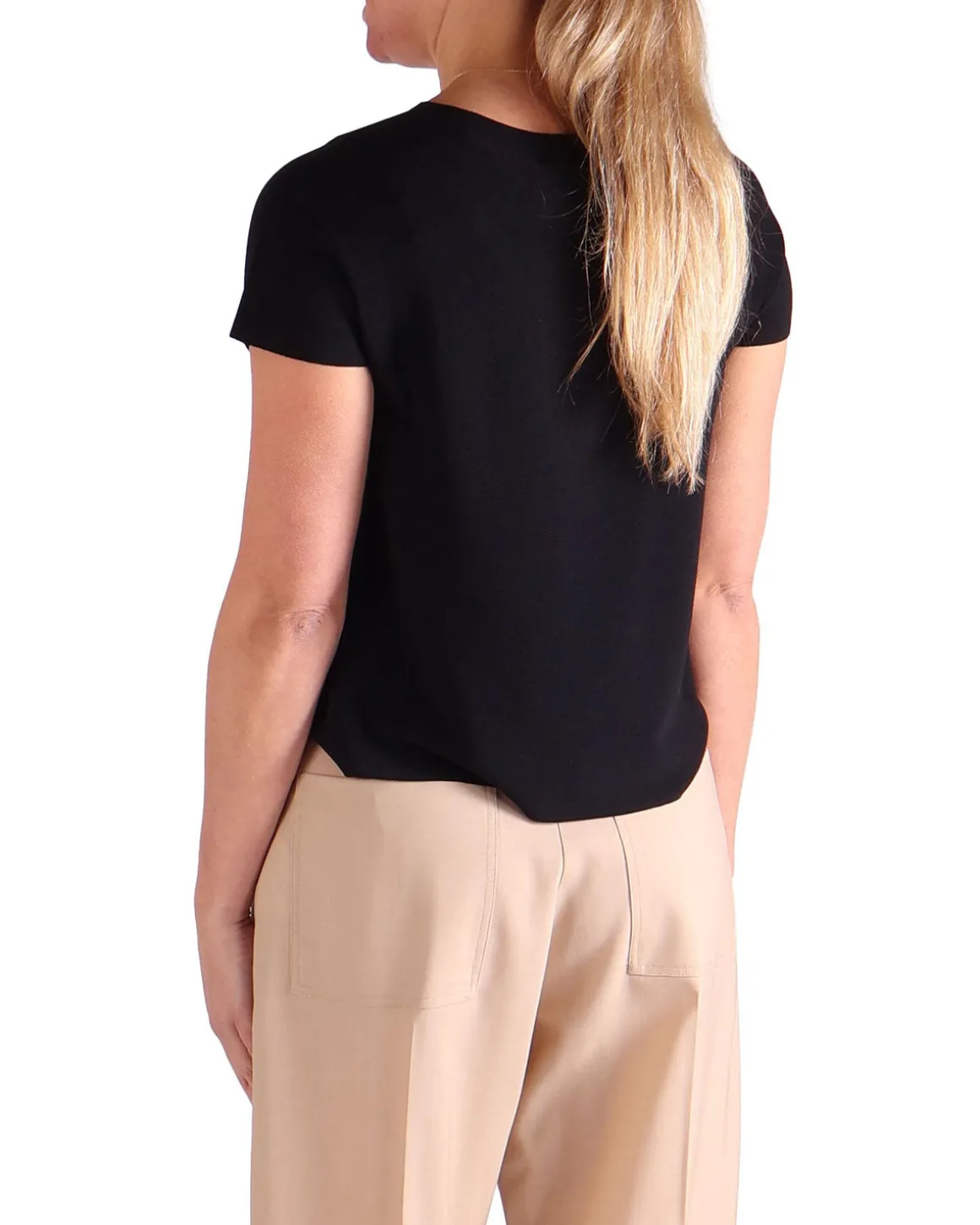 Deze zwarte top van LIVIANA CONTI heeft een eenvoudig maar elegant ontwerp, perfect voor elke gelegenheid. De hoogwaardige stof biedt comfort en ademend vermogen, terwijl de minimalistische stijl het makkelijk maakt om te combineren met verschillende onderstukken. Een veelzijdig stuk dat zowel casual als gekleed gedragen kan worden, en een vleugje verfijning aan je garderobe toevoegt.