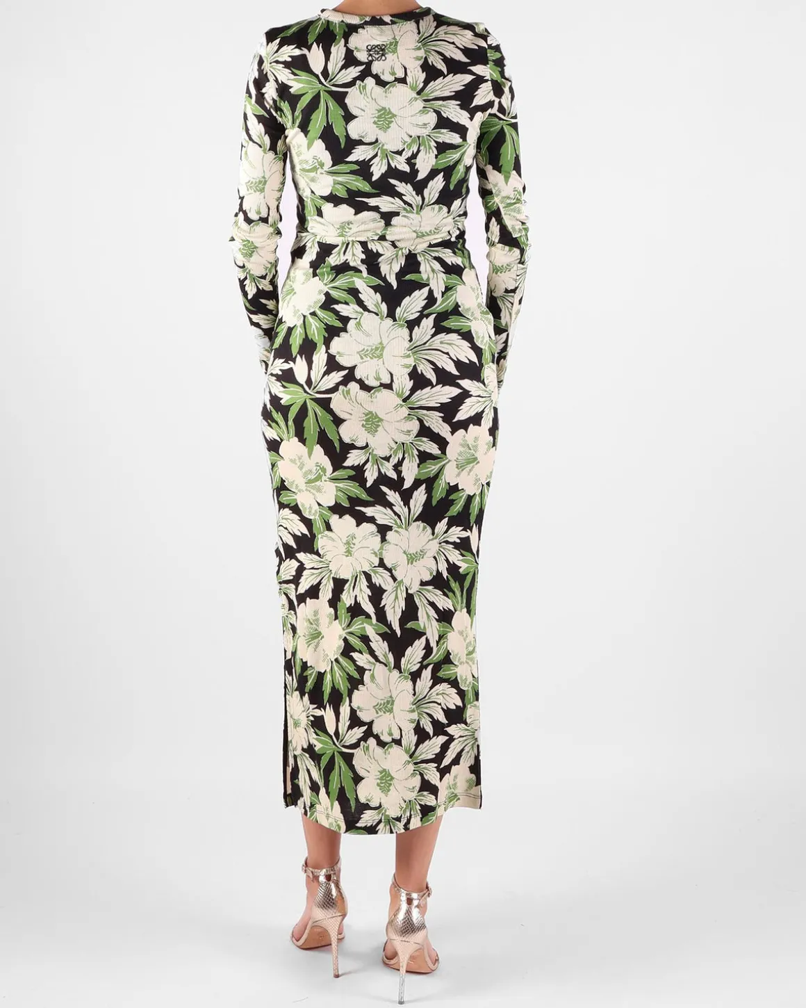 Deze zwarte lange, getailleerde jurk van Loewe heeft een opvallende bloemenprint, die een perfecte balans creëert tussen elegantie en vrouwelijkheid. De getailleerde pasvorm accentueert de lichaamsvorm, terwijl de zijsplit een vleugje sensualiteit en beweging aan het ontwerp toevoegt. Het bloemenmotief springt prachtig in het oog tegen de elegante zwarte stof, wat zorgt voor een gedurfde maar verfijnde uitstraling. Dankzij het moderne ontwerp en de verfijnde charme is deze jurk veelzijdig genoeg voor zowel formele evenementen als avonduitjes. De zachte, elastische stof biedt comfort, terwijl de zijsplit de jurk een moeiteloos chique uitstraling geeft.
