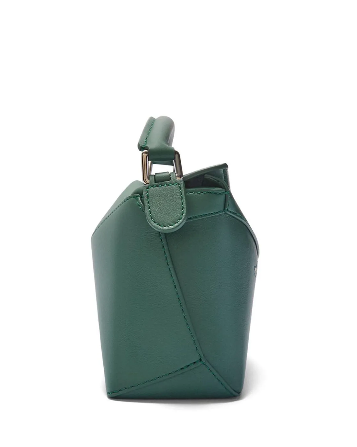 De LOEWE Octopus Mini Puzzle bag in Groen nappa kalfsleer is een opvallend stuk dat de kenmerkende kubusvorm van het merk combineert met precieze geometrische lijnen. De tas is versierd met het iconische Octopus-motief en biedt veelzijdige draagmogelijkheden: schoudertas, crossbody of handtas, dankzij de afneembare en verstelbare riem en het handvat. De ritssluiting met kalfsleren trekband voegt een verfijnde afwerking toe aan dit onderscheidende en functionele ontwerp.