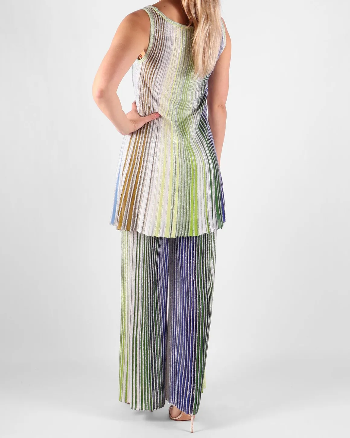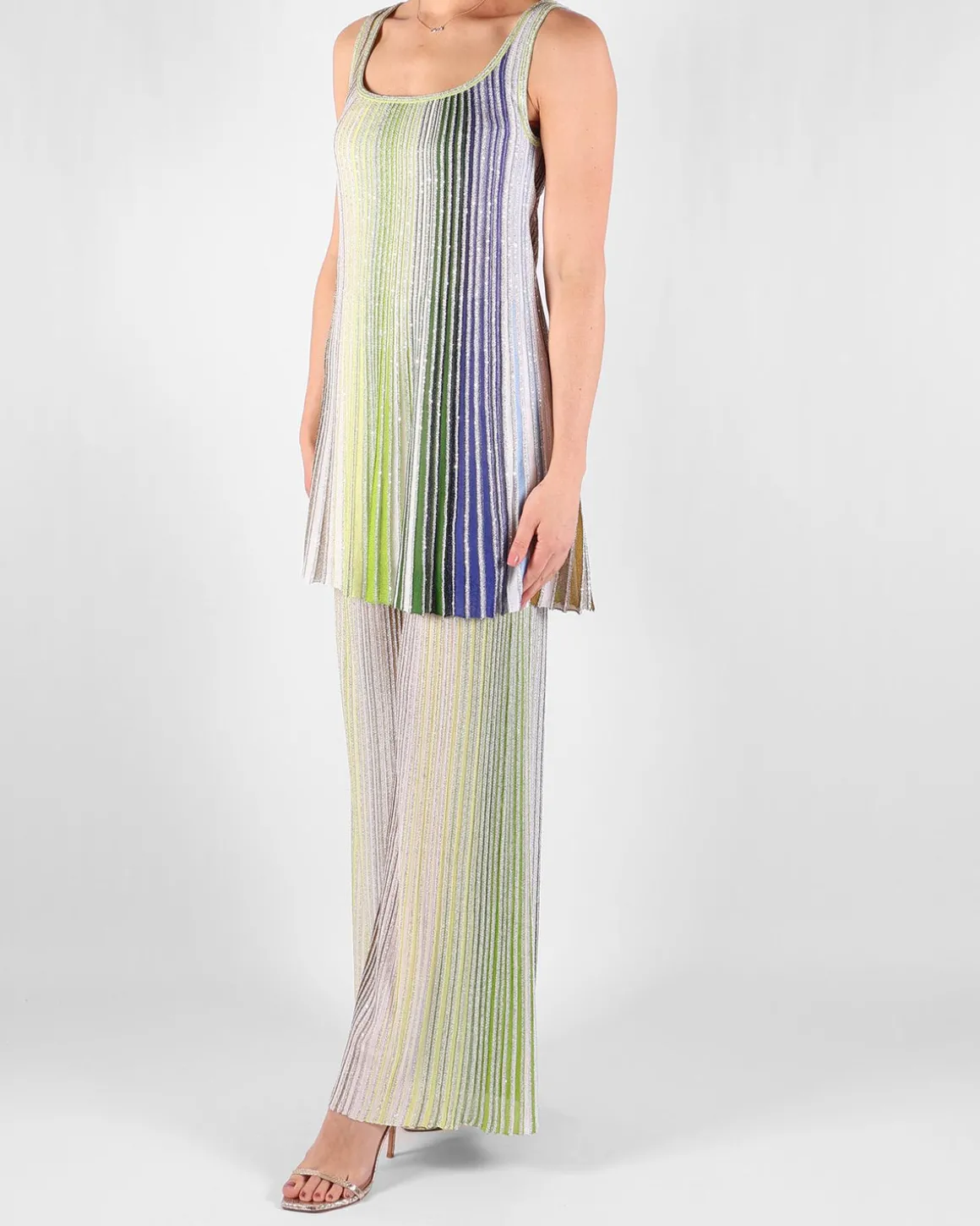 Deze mouwloze mini-jurk heeft de kenmerkende rechte lijnen van Missoni, met kleine sequins die in de stof zijn geweven, wat zorgt voor een subtiel shimmer-effect. Het resultaat is een verfijnde, glamoureuze uitstraling die perfect is voor een elegante avond. De aansluitende pasvorm benadrukt de figuur, terwijl de sequins een delicate sprankeling toevoegen. Combineer het met een eenvoudige clutch en hakken voor een chique, moderne stijl, ideaal voor een avondje uit.