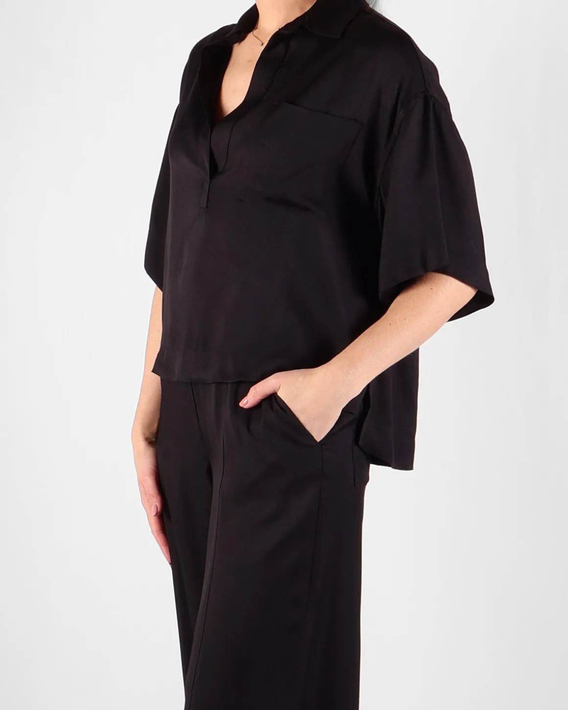 Deze zwarte blouse van Nude heeft een elegante uitstraling met dropped shoulders en losse mouwen, wat zorgt voor een comfortabele en moderne look. Het splitje aan de achterkant voegt een subtiel detail toe, terwijl de relaxte pasvorm de blouse perfect maakt voor zowel casual als chique outfits. Combineer het met een nette broek of jeans voor een moeiteloze, stijlvolle look.