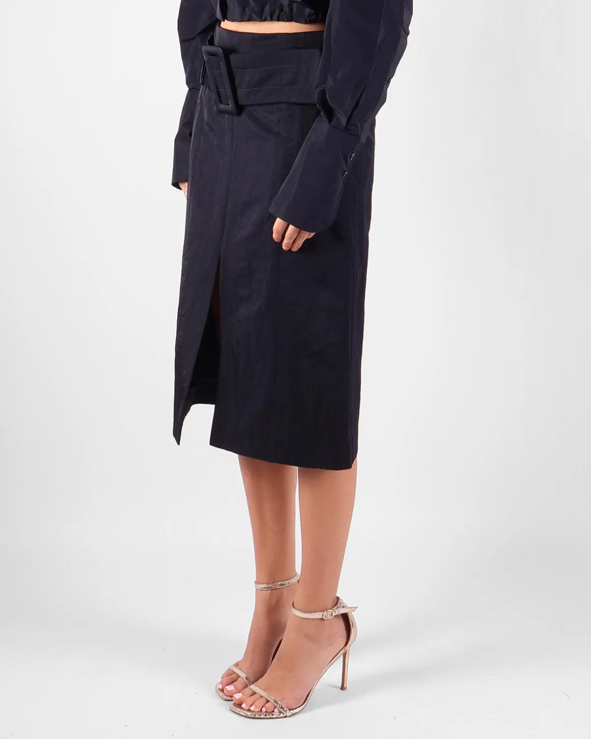 Deze navy blauwe rok van Patou heeft een elegante, maar moderne stijl. De split aan de voorkant voegt een subtiele vleugje allure toe, terwijl de brede zelfstrikband in de taille het silhouet benadrukt en een chique detail aan het ontwerp toevoegt. De diepe navy kleur maakt het veelzijdig en gemakkelijk te combineren met verschillende tops, perfect voor zowel casual als geklede gelegenheden.