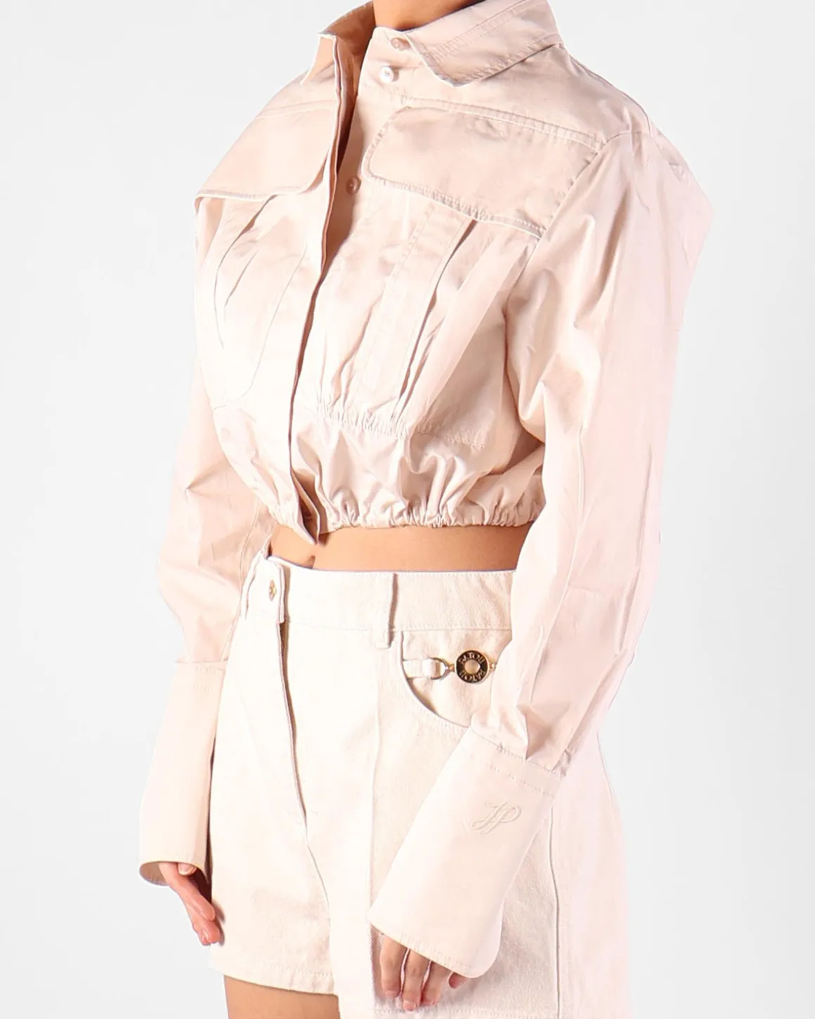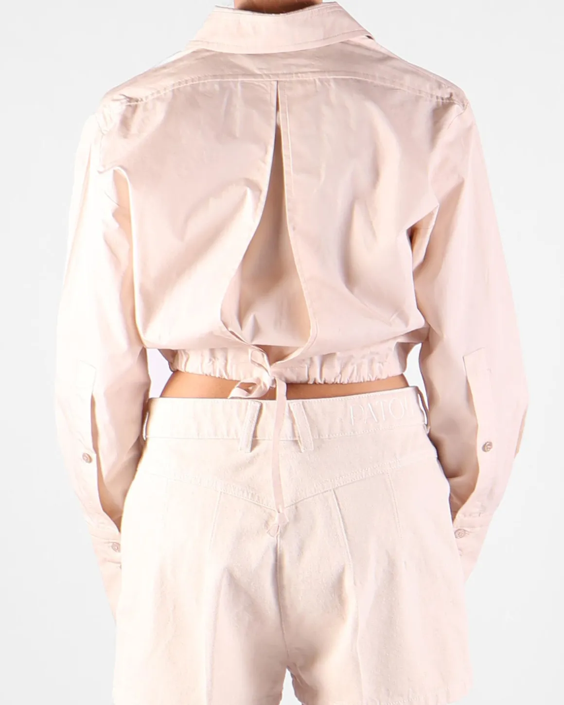 Dit ecru korte T-shirt van Patou combineert casual elegantie met een modern ontwerp. De pullover taille kan aan de achterkant worden gestrikt, waardoor de pasvorm kan worden aangepast en het silhouet wordt benadrukt. De flapzakken aan de voorkant voegen een praktische en stijlvolle detail toe, terwijl de knoopsluiting aan de voorkant en de kraag een klassieke uitstraling geven. De achterkant heeft een dubbele laag, waarbij de bovenste laag een split heeft, waardoor je een glimp van de binnenkant ziet voor een unieke en modieuze twist. Perfect voor een veelzijdige look, dit T-shirt is gemakkelijk te combineren met verschillende onderstukken.