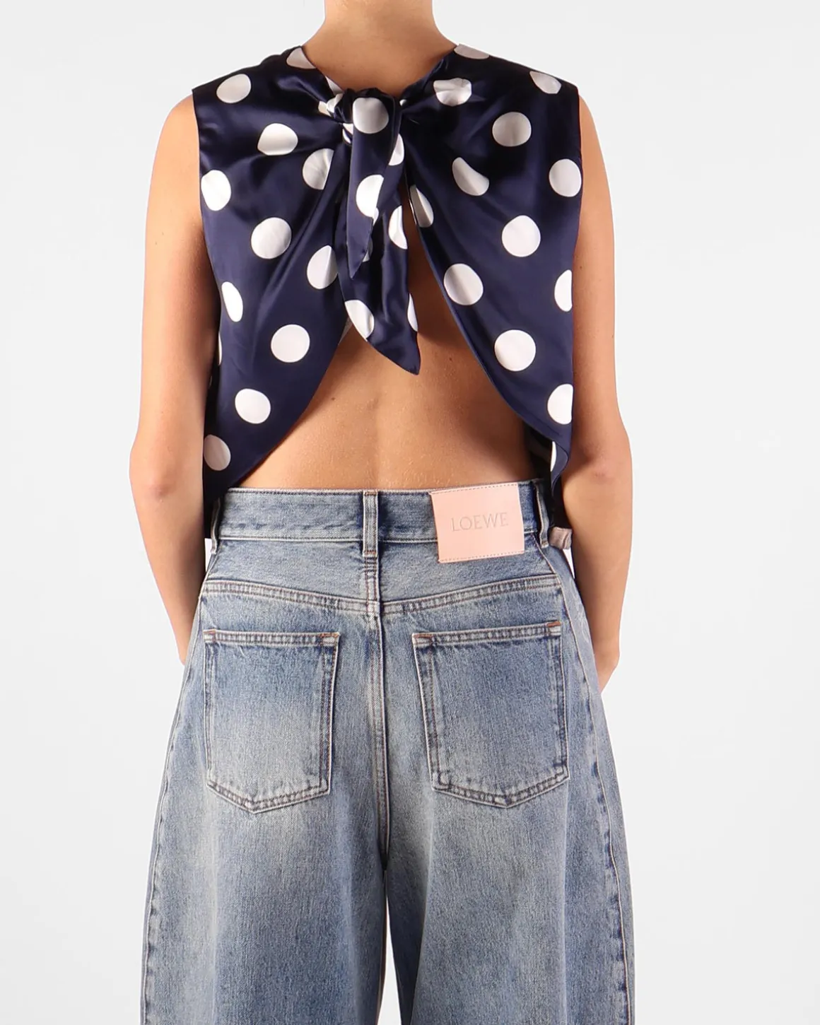 Deze marineblauwe top met witte polka dots van Patou heeft een speels en chique ontwerp. De top beschikt over een unieke strikdetail aan de achterkant, waarmee je de pasvorm kunt aanpassen en een extra stijlvol accent toevoegt. Het polka dot patroon voegt een leuke en tijdloze uitstraling toe, terwijl de marineblauwe kleur het veelzijdig en elegant maakt. Deze top kan gemakkelijk worden gecombineerd met verschillende onderstukken, van casual jeans tot rokken, voor zowel informele als geklede looks.