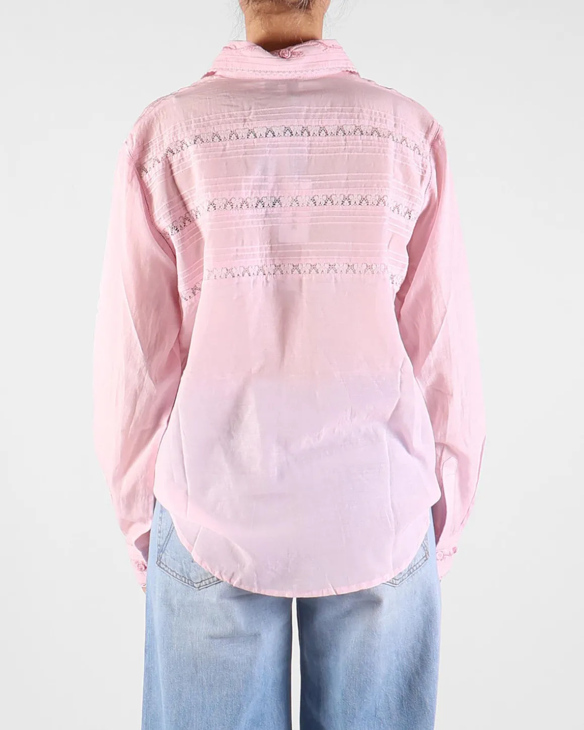 Deze roze blouse van Paul & Joe heeft een verfijnde en vrouwelijke uitstraling dankzij de delicate kanten details. De zachte stof en het elegante ontwerp maken het een veelzijdig stuk, perfect voor zowel chique als casual gelegenheden. Een prachtige keuze voor een romantische en stijlvolle look.