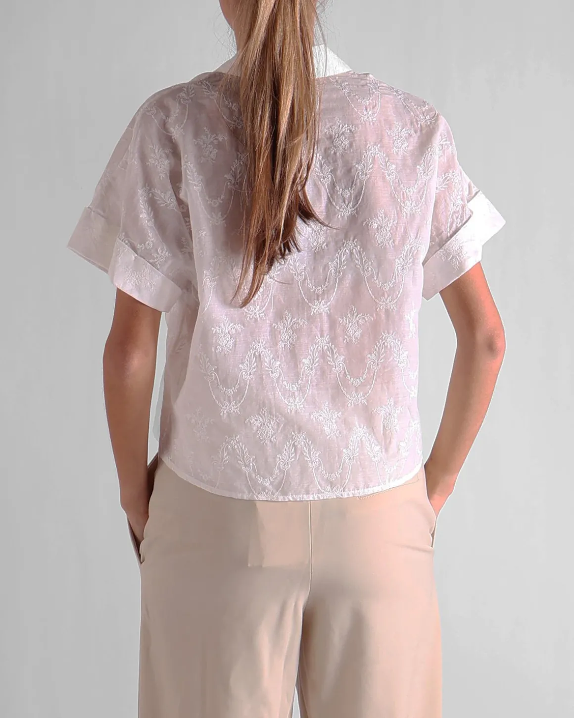 Deze witte blouse van Paul & Joe is een verfijnde combinatie van klassieke en vrouwelijke elementen. De delicate kanten details voegen een subtiele luxe toe, terwijl de knoopsluiting zorgt voor een elegante afwerking. Perfect voor een chique, maar toch comfortabele uitstraling.