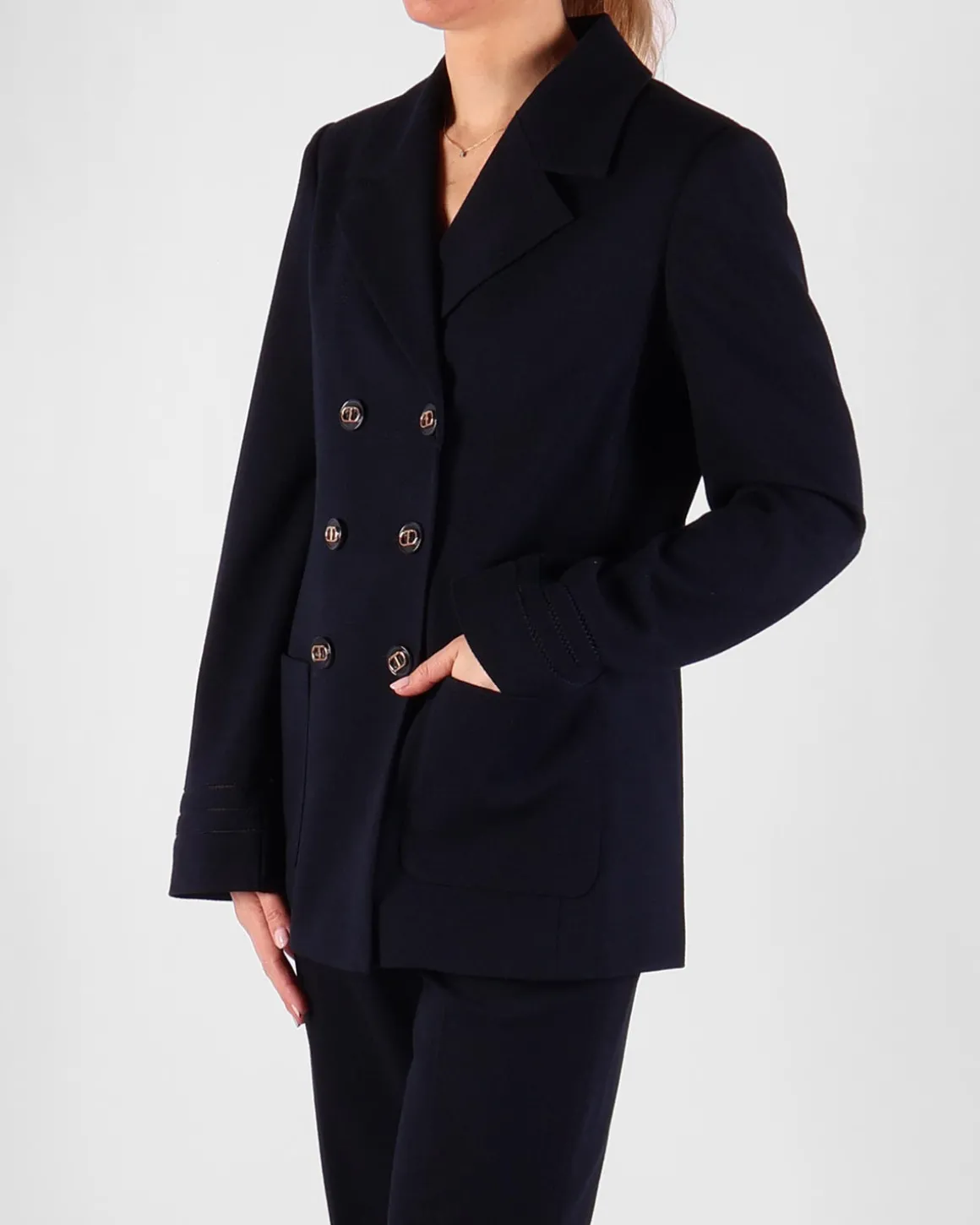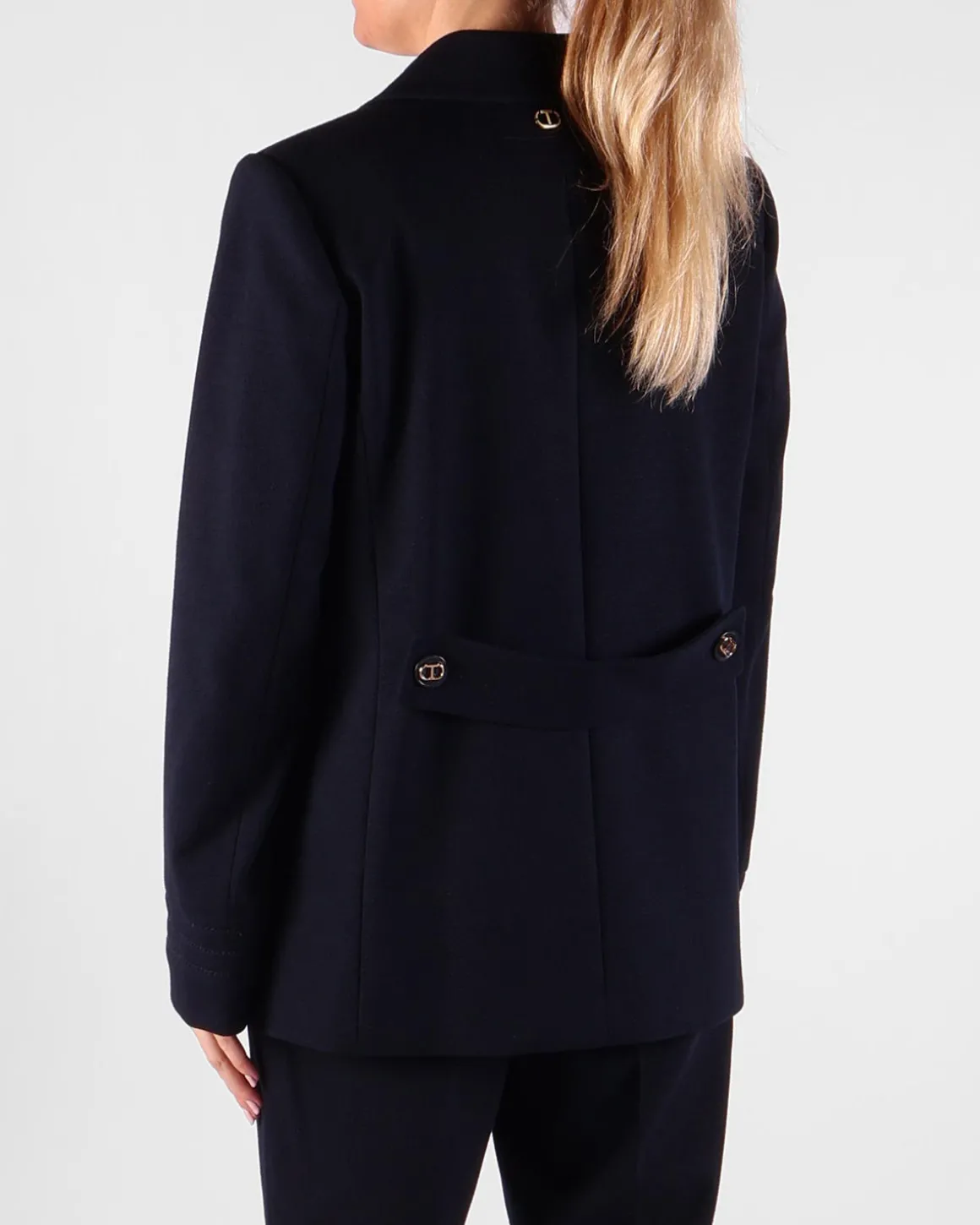 Deze donkerblauwe blazer van Twinset heeft opvallende zwarte en gouden knopen, elk met het iconische Twinset-logo, wat een luxe touch toevoegt aan het klassieke ontwerp. De getailleerde pasvorm flatteert de silhouet, terwijl de rijke blauwe kleur het veelzijdig maakt voor zowel formele als semi-formele gelegenheden. De gedurfde logo-knopen geven de verfijnde uitstraling een moderne draai. Perfect om zowel op een chique als casual manier te dragen, deze blazer is een tijdloze aanvulling op je garderobe.