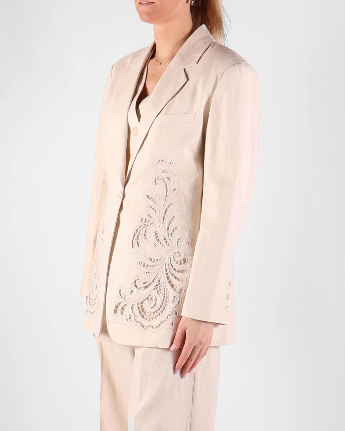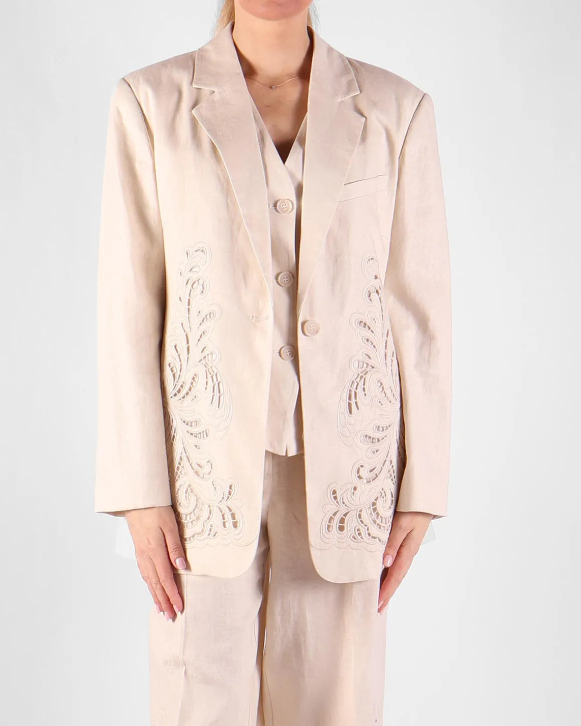 Deze ivory blazer van Twinset is ontworpen met verfijnde cutwork-details aan de voorkant, wat een moderne en elegante touch toevoegt aan de klassieke snit. De strakke lijnen en de getailleerde pasvorm creëren een flatterende vorm, terwijl de cutwork een uniek en verfijnd element biedt. Perfect voor zowel formele als semi-casual gelegenheden, brengt deze blazer elegantie en veelzijdigheid in je garderobe. De tijdloze kleur maakt het gemakkelijk te combineren met verschillende outfits, van jurken tot broeken.