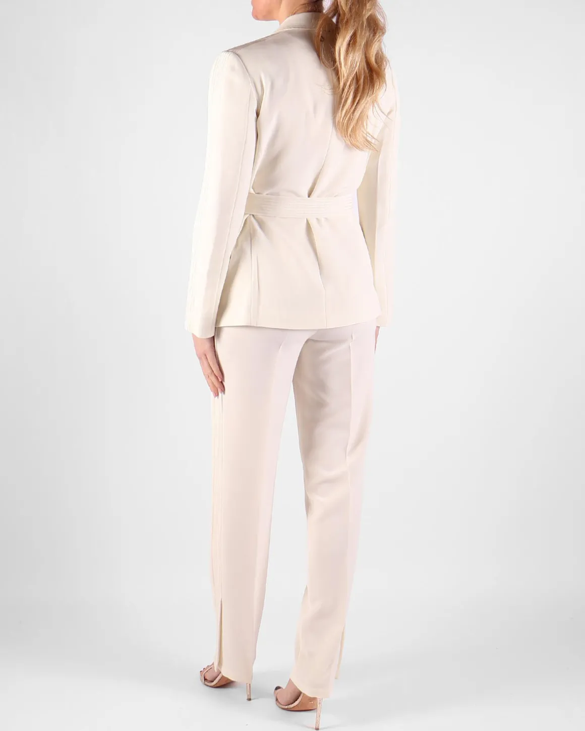 Deze ecru blazer van Twinset heeft een elegante en moderne uitstraling, dankzij de strakke snit en de bijpassende ceintuur die de taille accentueert. Het lichte materiaal maakt het perfect voor zowel warme dagen als als laagje in koelere seizoenen. Een veelzijdig stuk dat elke outfit een verfijnde touch geeft.