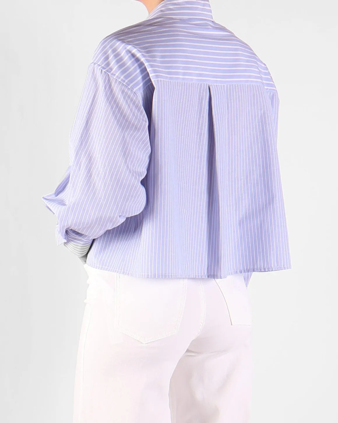 Deze blauwe korte blouse in shirtstijl van TWINSET heeft witte strepen en een losse pasvorm met een plooi aan de achterkant voor een extra elegante touch. De flapzakken op de borst voegen een functioneel en trendy detail toe. Een veelzijdig stuk dat zowel casual als chique gedragen kan worden.