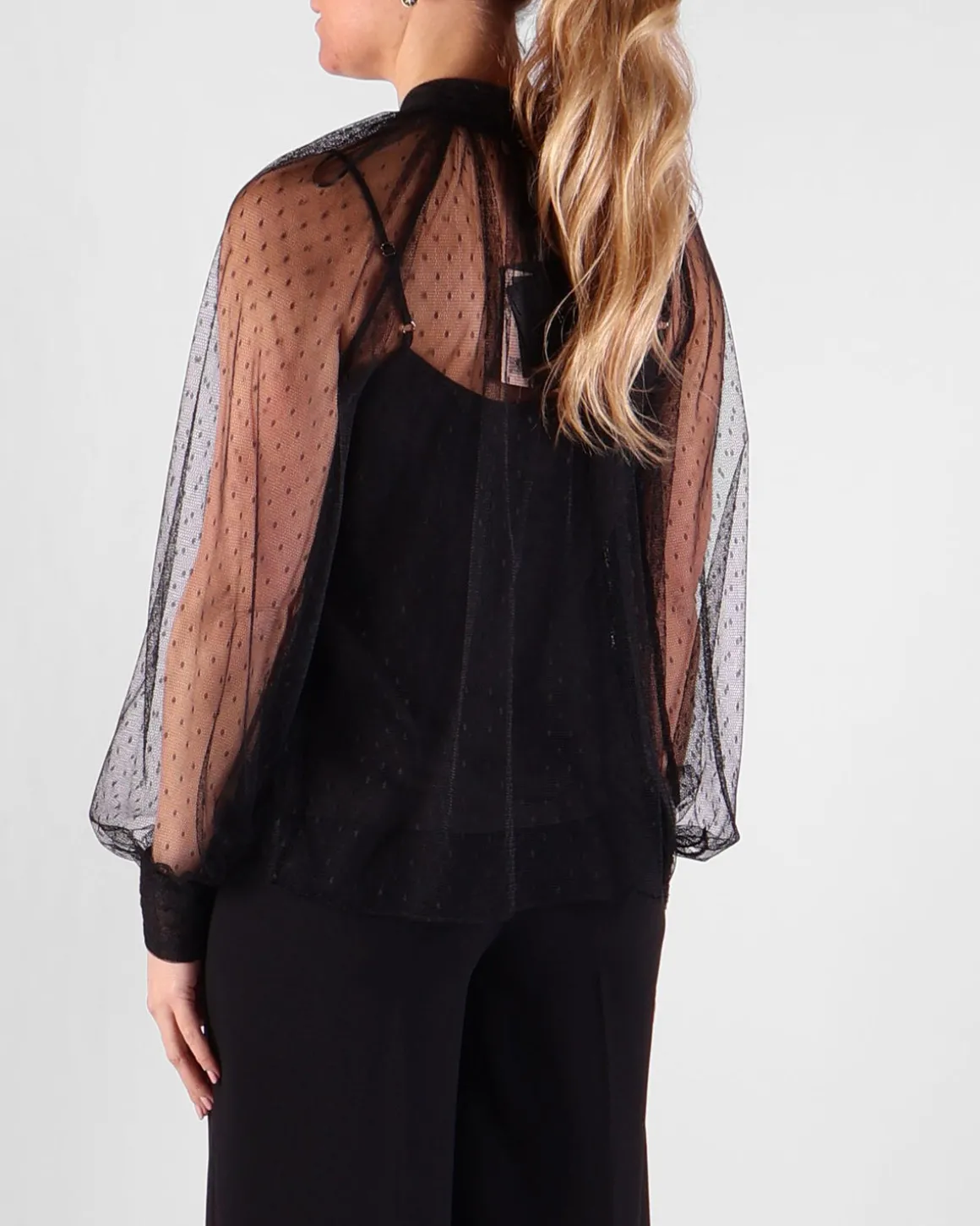 Deze zwarte transparante crochet blouse van TWINSET heeft een losse, ontspannen pasvorm en een stijlvolle kraag met een strikdetail voor een aanpasbare look. Het delicate crochet-materiaal voegt textuur en verfijning toe, terwijl de bijgeleverde slip zorgt voor comfort en bedekking. Perfect om te combineren of los te dragen voor een luchtige, elegante stijl.