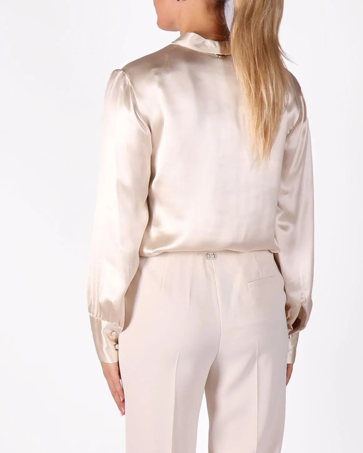 Deze glanzende, zachte satijnen blouse in ecru straalt elegantie en verfijning uit, perfect voor elke gelegenheid. De luxueuze stof valt prachtig en biedt een flatterende silhoe?t die net zo goed aanvoelt als het eruit ziet. Combineer het moeiteloos met jeans voor een casual look of draag het met een rok voor een meer gepolijste uitstraling.
