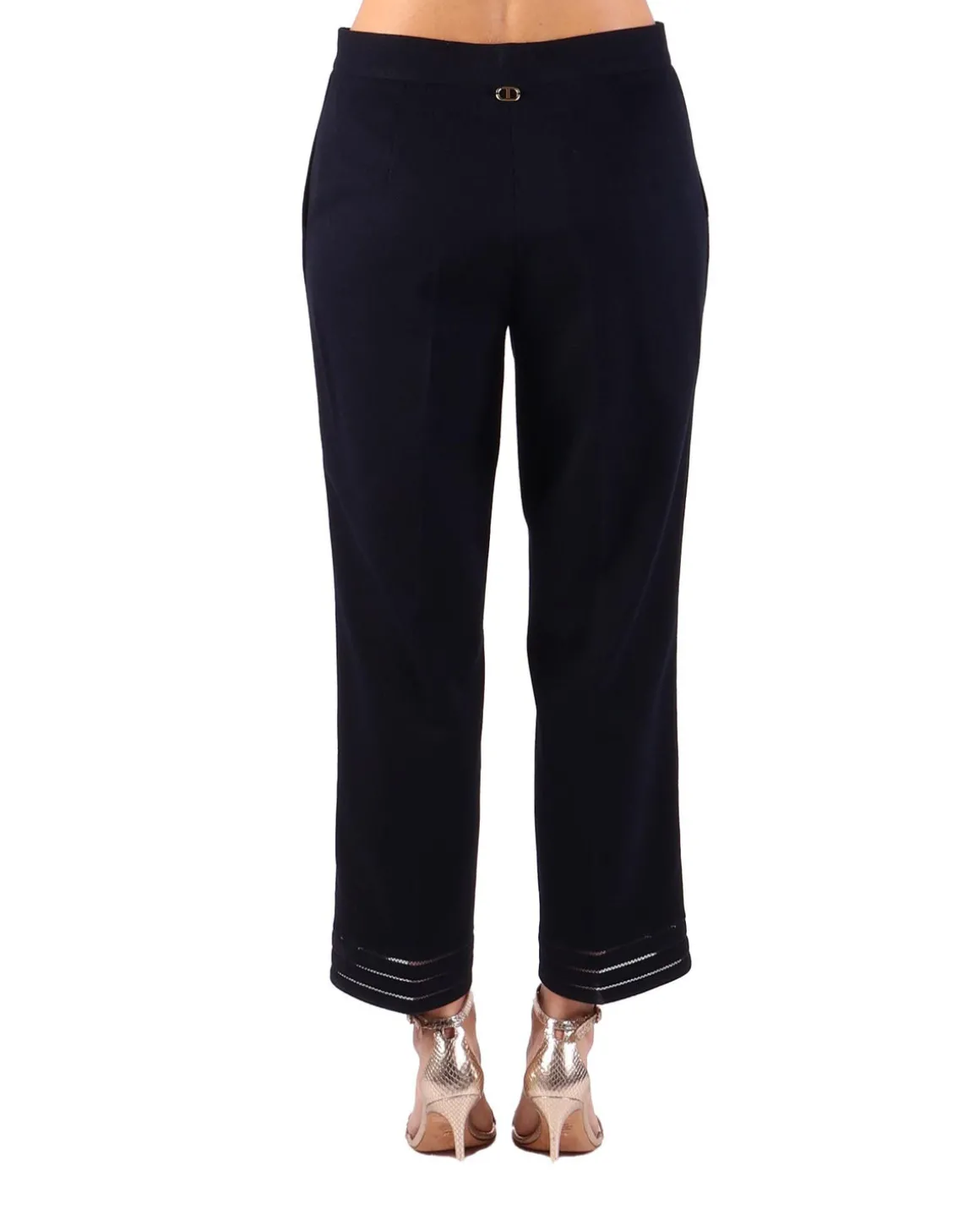 Deze donkerblauwe formele broek van Twinset heeft een unieke gestreepte haakwerk zoom, die een verfijnde en stijlvolle touch toevoegt aan het elegante ontwerp. De getailleerde pasvorm en de rijke blauwe kleur maken ze veelzijdig voor zowel professionele als semi-formele gelegenheden. Gemaakt van hoogwaardige stof, bieden ze comfort terwijl ze een elegante en gepolijste uitstraling behouden. Perfect te combineren met blouses, blazers of chique tops, deze broek valt op door het verfijnde detail.