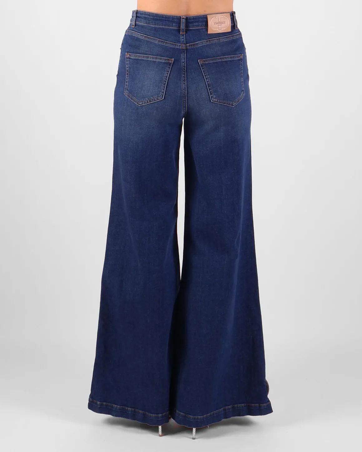 Deze donkerblauwe jeans van Twinset met een wijde pijp bieden een stijlvolle, relaxte pasvorm die het figuur flatteert en tegelijkertijd een moderne, ontspannen uitstraling heeft. De rijke blauwe kleur maakt ze veelzijdig voor verschillende gelegenheden, of ze nu worden gecombineerd met een casual t-shirt of een chique blouse. Het ontwerp met wijde pijpen voegt comfort en bewegingsvrijheid toe, waardoor ze een moeiteloos coole silhouet creëren. Perfect voor zowel overdag als ’s avonds, deze jeans zijn een must-have aanvulling op je garderobe.