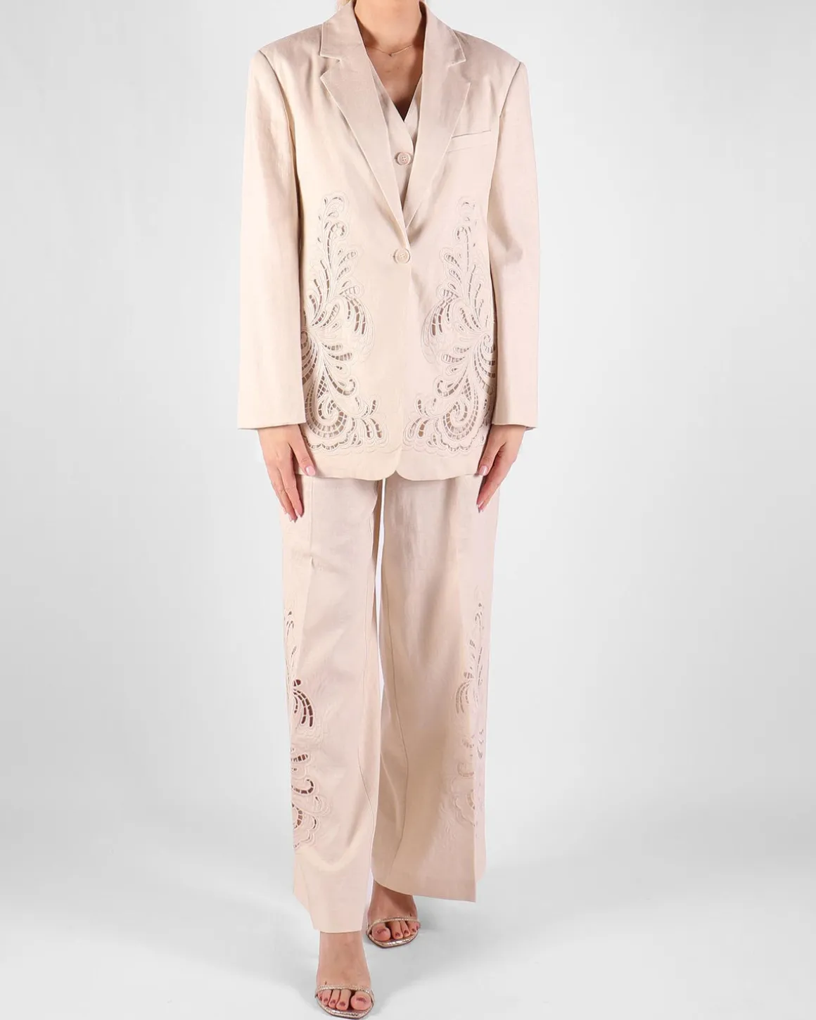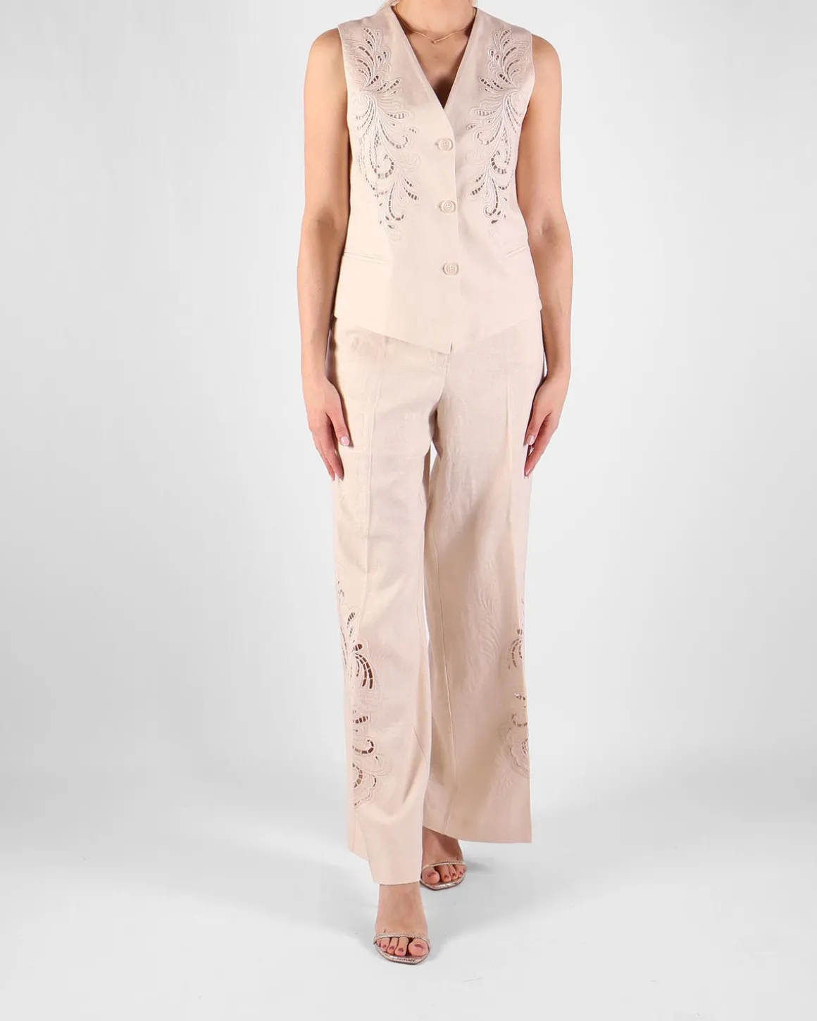 Deze ivory broek van Twinset is voorzien van elegante cutwork-details aan de voorkant, wat een uniek en verfijnd accent toevoegt aan het klassieke ontwerp. Gemaakt van hoogwaardig materiaal, bieden ze zowel comfort als stijl, waardoor ze perfect zijn voor zowel casual als chiquere gelegenheden. De slanke, getailleerde pasvorm benadrukt de silhouet, terwijl de cutwork de uitstraling naar een hoger niveau tilt. Ideaal om te combineren met blouses of jassen, deze broek is een veelzijdige aanvulling op je garderobe.