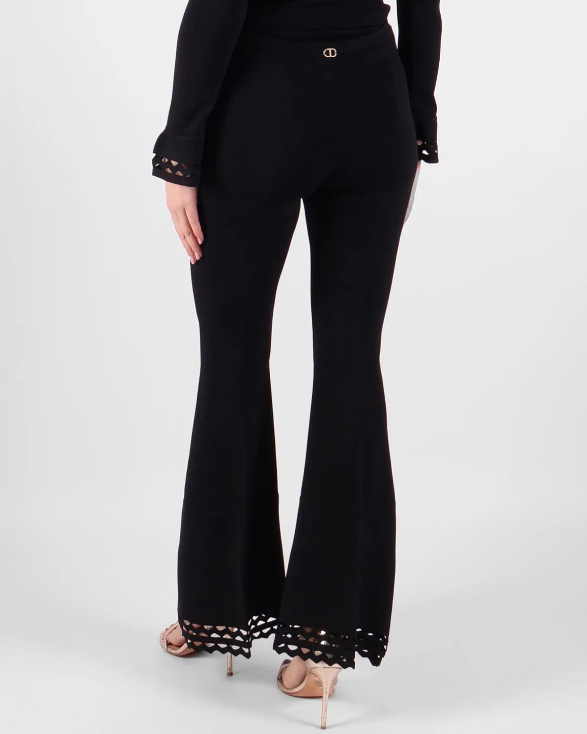Deze zwarte pantalon van Twinset heeft een hoge elastische taille die zorgt voor comfort en een flatterende pasvorm. De details aan de onderkant voegen een verfijnde touch toe aan het ontwerp, waardoor de broek zowel stijlvol als praktisch is. Perfect voor een elegante, casual-chique look.