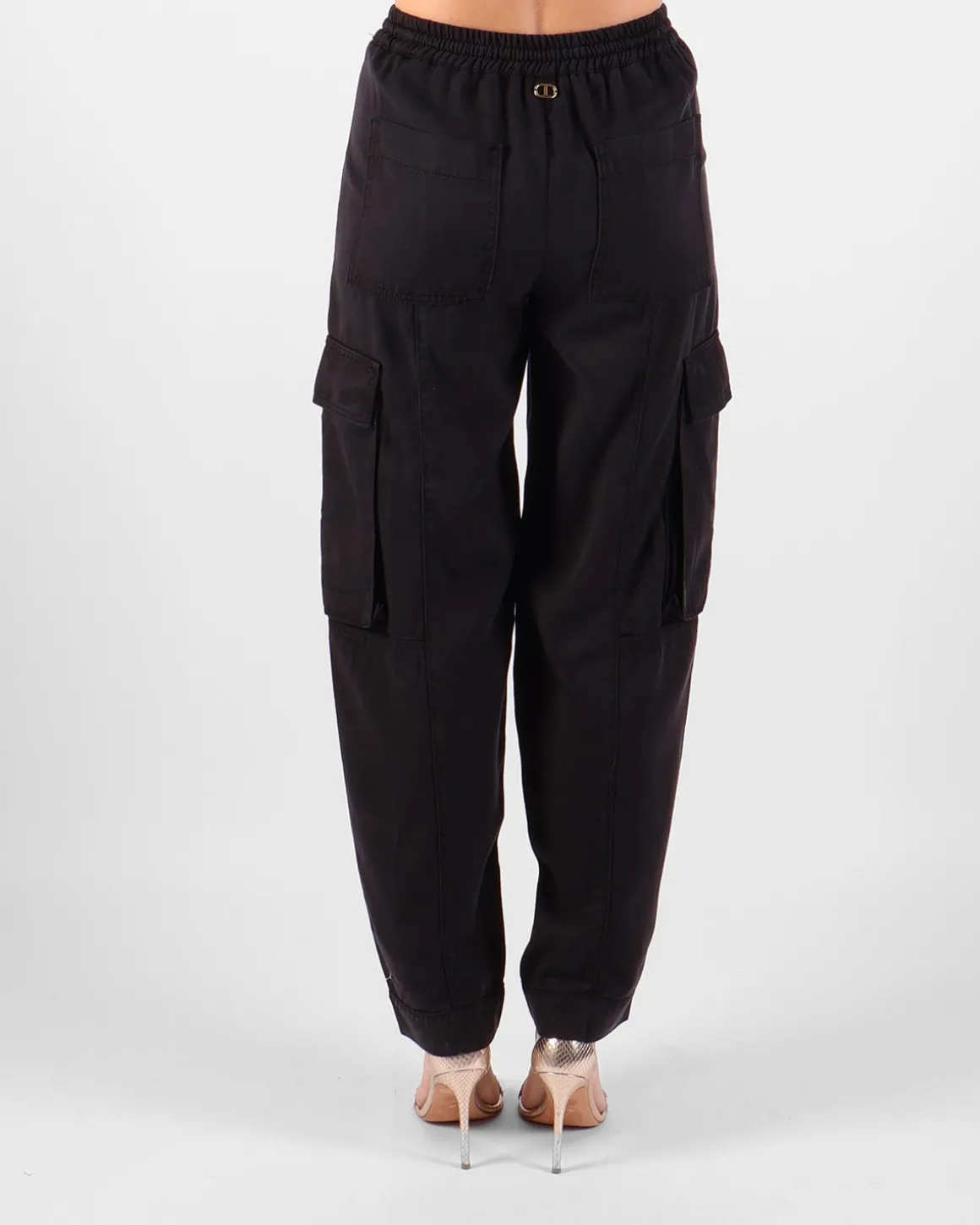 Deze zwarte TWINSET broek heeft een comfortabel, rekbaar materiaal met een elastische tailleband en een trekkoord voor een verstelbare pasvorm. De toegevoegde zakken aan de voorkant zorgen voor een praktische en toch stijlvolle uitstraling. Het zachte, ademende materiaal is perfect voor de hele dag draagcomfort, en biedt zowel stijl als comfort. De veelzijdige zwarte kleur past moeiteloos bij elk bovenstuk voor een chique, casual look.