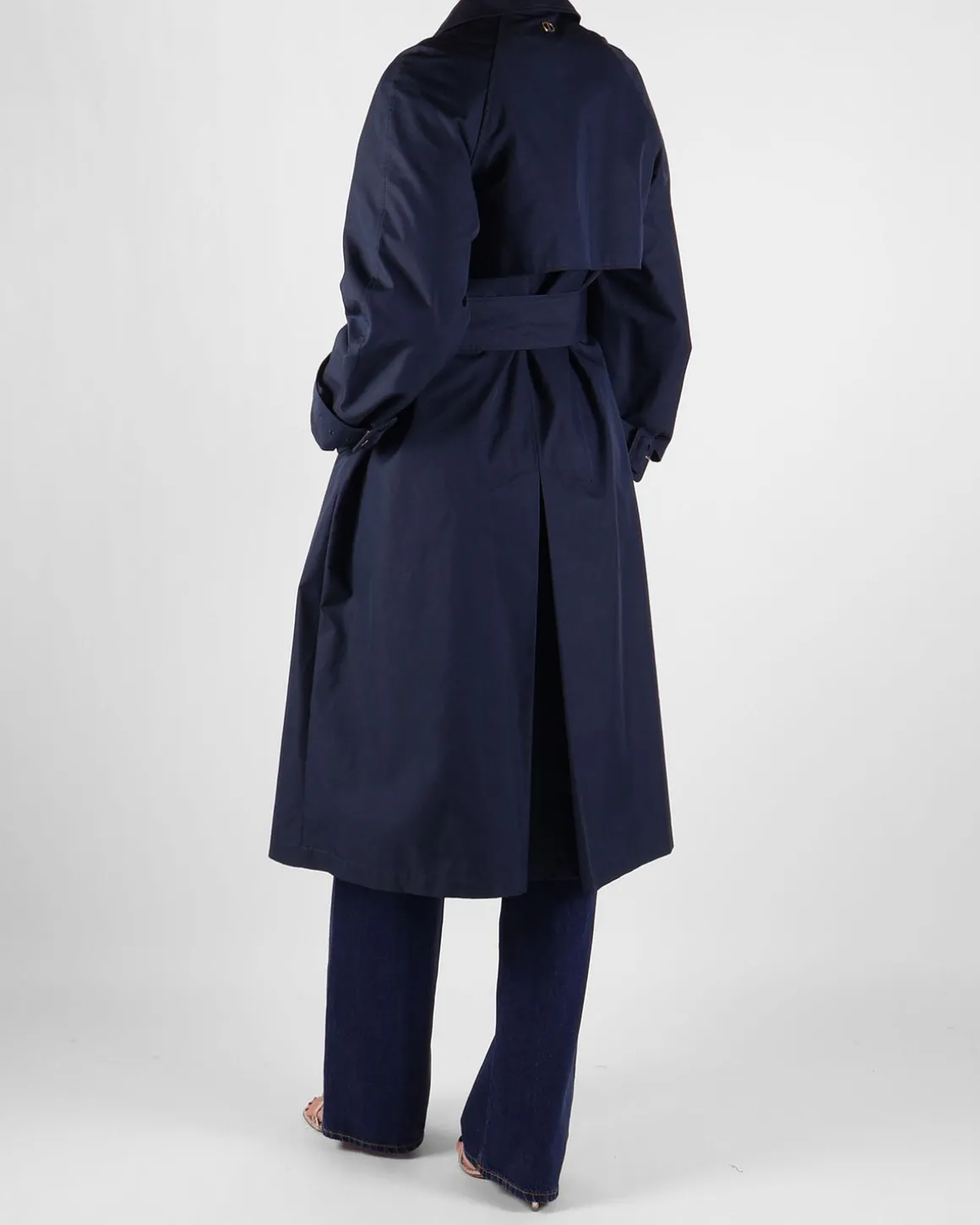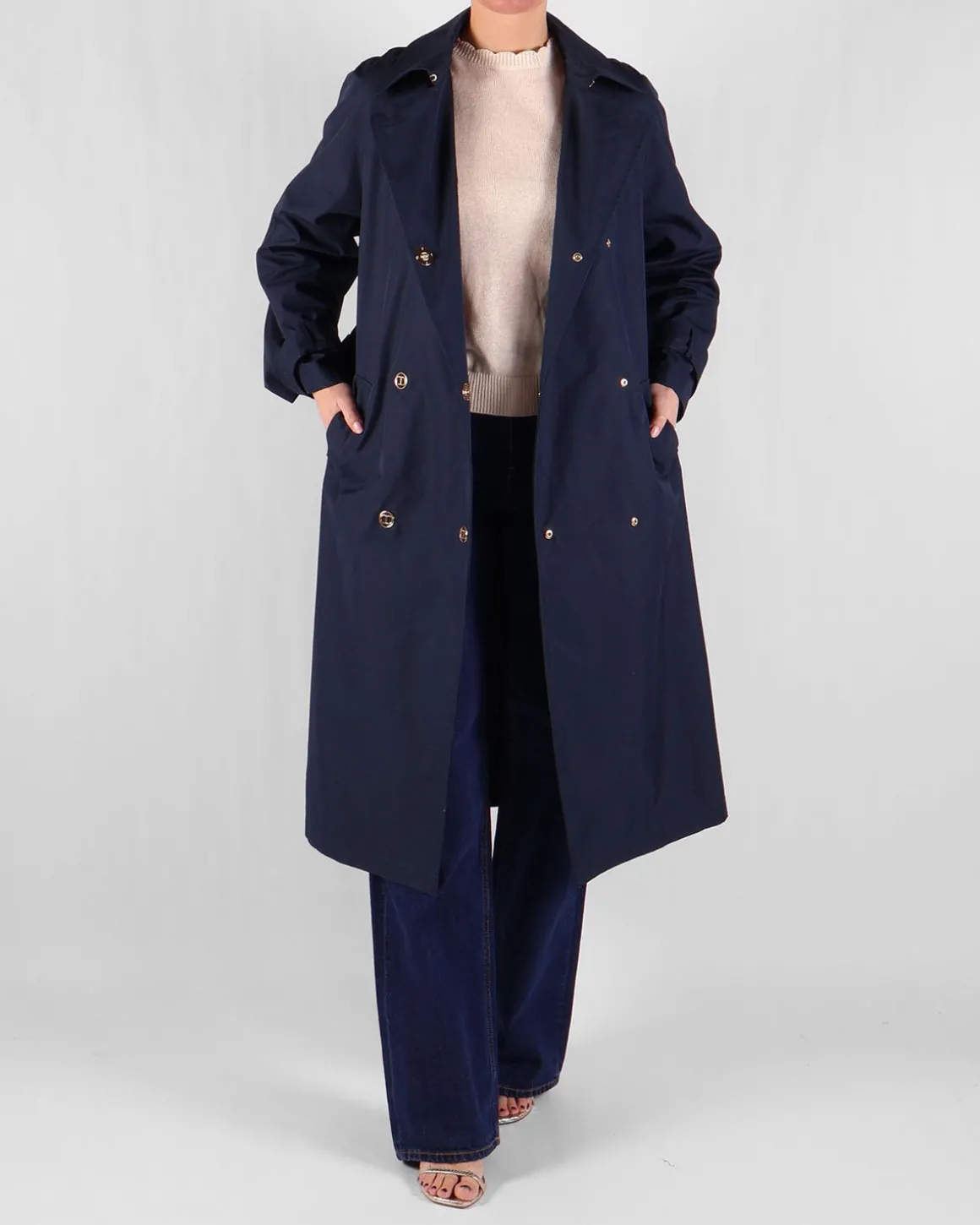 Deze blauwe jas van TWINSET heeft een gouden logo-knop, wat een vleugje luxe aan het ontwerp toevoegt. De brede kraag en de vaste, brede riem om de taille te strikken geven de jas een gestructureerde en stijlvolle uitstraling. Een chique en verfijnd stuk dat gemakkelijk zowel casual als meer gekleed gedragen kan worden.