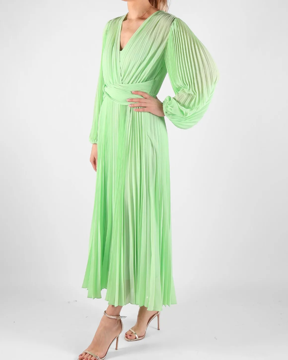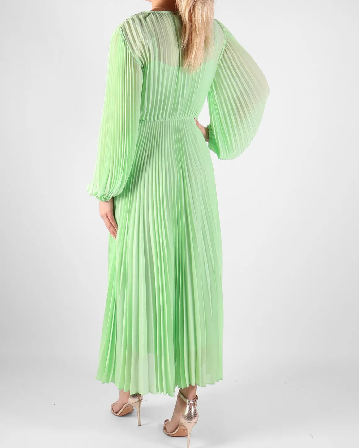 Deze lange mintgroene plisséjurk van Twinset straalt elegantie en verfijning uit. De luchtige plisséstof zorgt voor een vloeiende beweging en een vrouwelijke uitstraling. Perfect voor zowel feestelijke gelegenheden als zomerse dagen met een chique touch.
