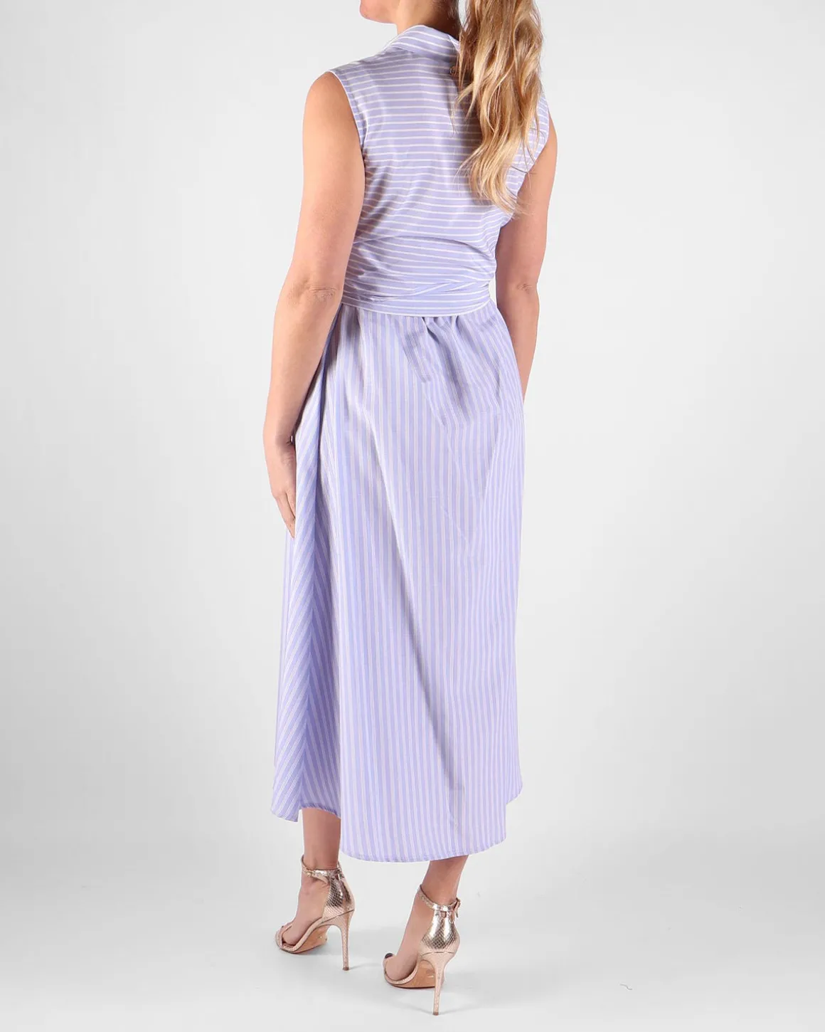 Deze blauwe mouwloze jurk van TWINSET heeft opvallende witte strepen en wordt geleverd met een brede riem om in de taille te strikken, wat de silhouet accentueert. Het lichte materiaal en de flatterende snit maken het perfect voor warme dagen of casual gelegenheden. Een chique en veelzijdig stuk, makkelijk op te kleeden of casual te dragen.