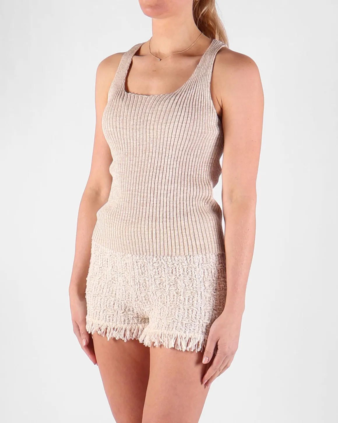 Deze beige mouwloze top van TWINSET is gemaakt van dik gebreid materiaal met gouden draad door het hele ontwerp, wat een vleugje elegantie en glitter toevoegt. De rijke textuur en luxe details maken het perfect voor zowel casual als chique looks. Een chique en veelzijdige toevoeging aan je garderobe.