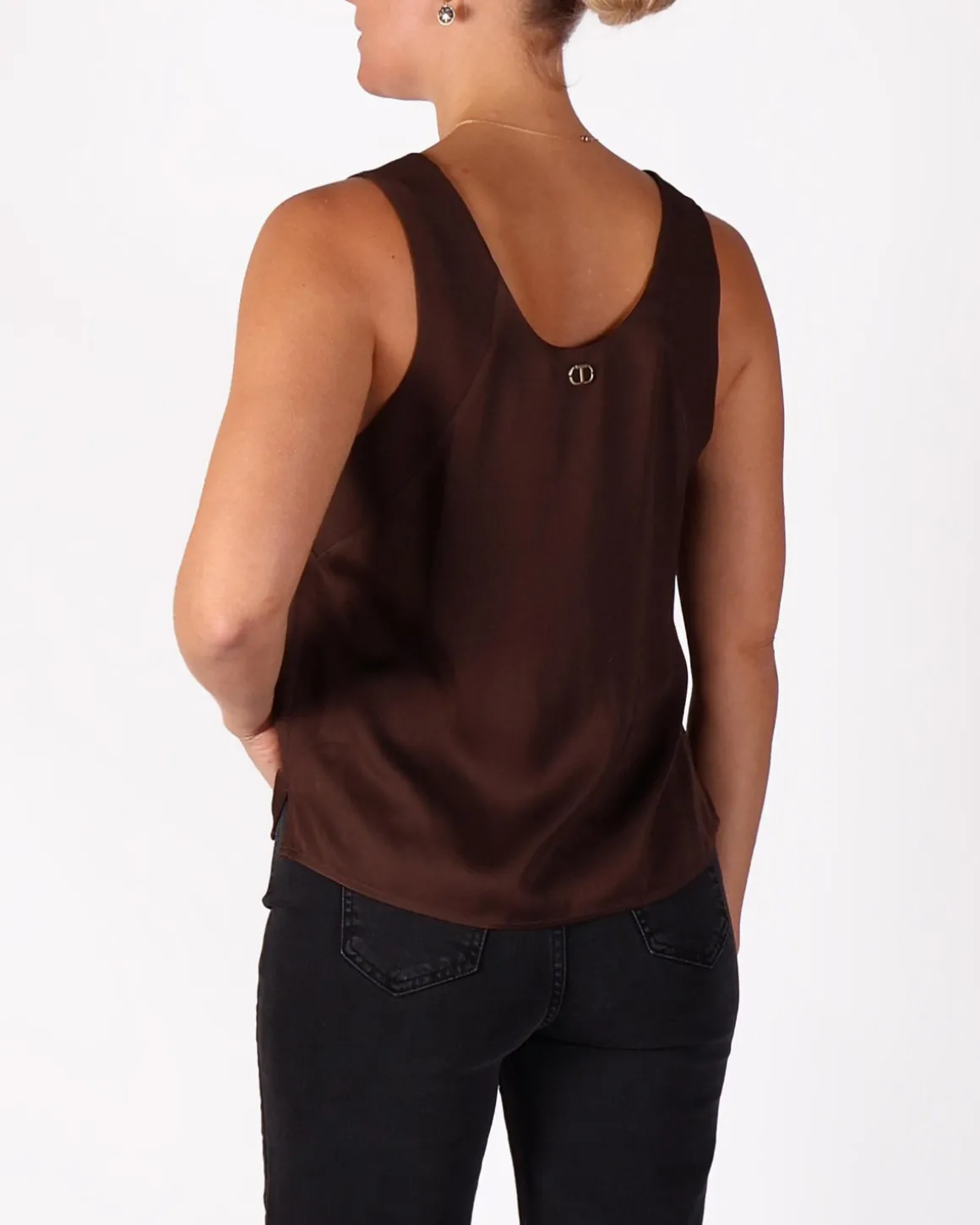 Deze bruin mouwloze top van Twinset is een veelzijdige aanvulling op je garderobe. Gemaakt van luxe materialen, biedt hij zowel comfort als stijl met een eigentijdse snit. De warme tint is perfect voor het combineren met zowel jeans als een elegante rok, waardoor je altijd goed voor de dag komt.