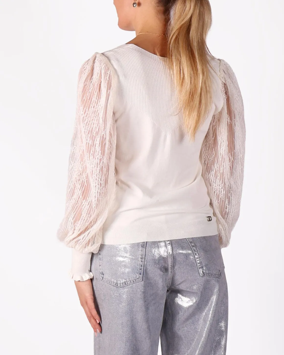 Deze ecru top van Twinset heeft een prachtige textuur op het lichaam die je warm houdt, terwijl de kanten mouwen een stijlvolle touch toevoegen. De combinatie van gezellige stof en elegante details creëert een verfijnde uitstraling. Perfect voor het dragen in lagen of om alleen te dragen, dit stuk is een must-have voor je garderobe!