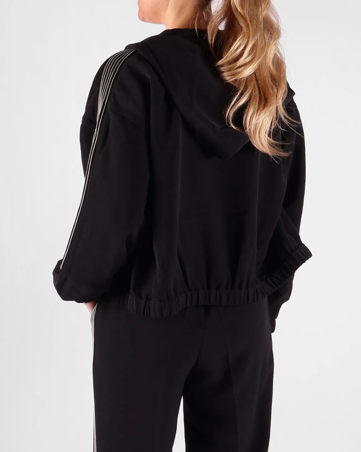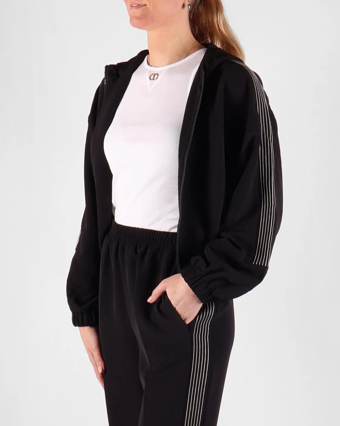 Dit zwarte vest van Twinset heeft een sportieve uitstraling dankzij de ritssluiting en de witte strepen op de mouwen. De capuchon voegt extra comfort en functionaliteit toe, terwijl het minimalistische ontwerp het vest veelzijdig maakt. Perfect voor een casual look met een moderne flair.