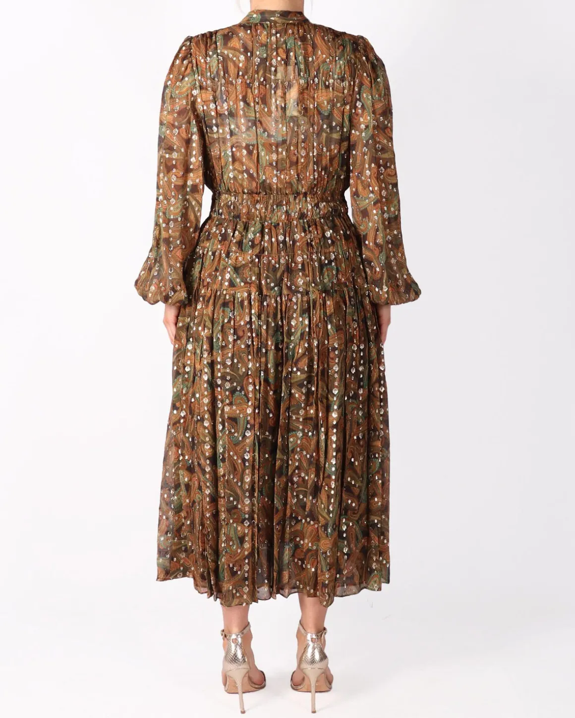 De khaki maxi jurk van Ulla Johnson straalt elegantie uit met zijn verfijnde print en vloeiende silhouet. De jurk is verfraaid met subtiele gouden details die een vleugje luxe toevoegen aan het ontwerp. Perfect voor zowel casual als chique gelegenheden, biedt deze jurk een tijdloze en stijlvolle uitstraling.