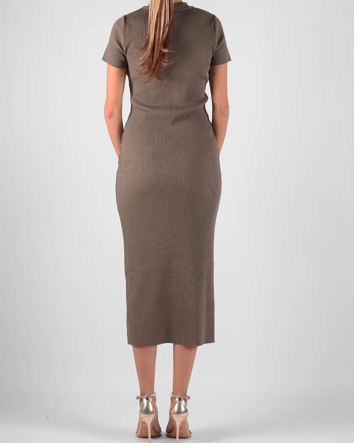 Deze taupe midi-jurk van Vince is gemaakt van zachte ribstof en heeft een tijdloze, elegante uitstraling. Het ontwerp met korte mouwen en een comfortabele pasvorm zorgt voor een verfijnde look. Perfect voor zowel casual als chique gelegenheden, met een luxe en minimalistische flair.