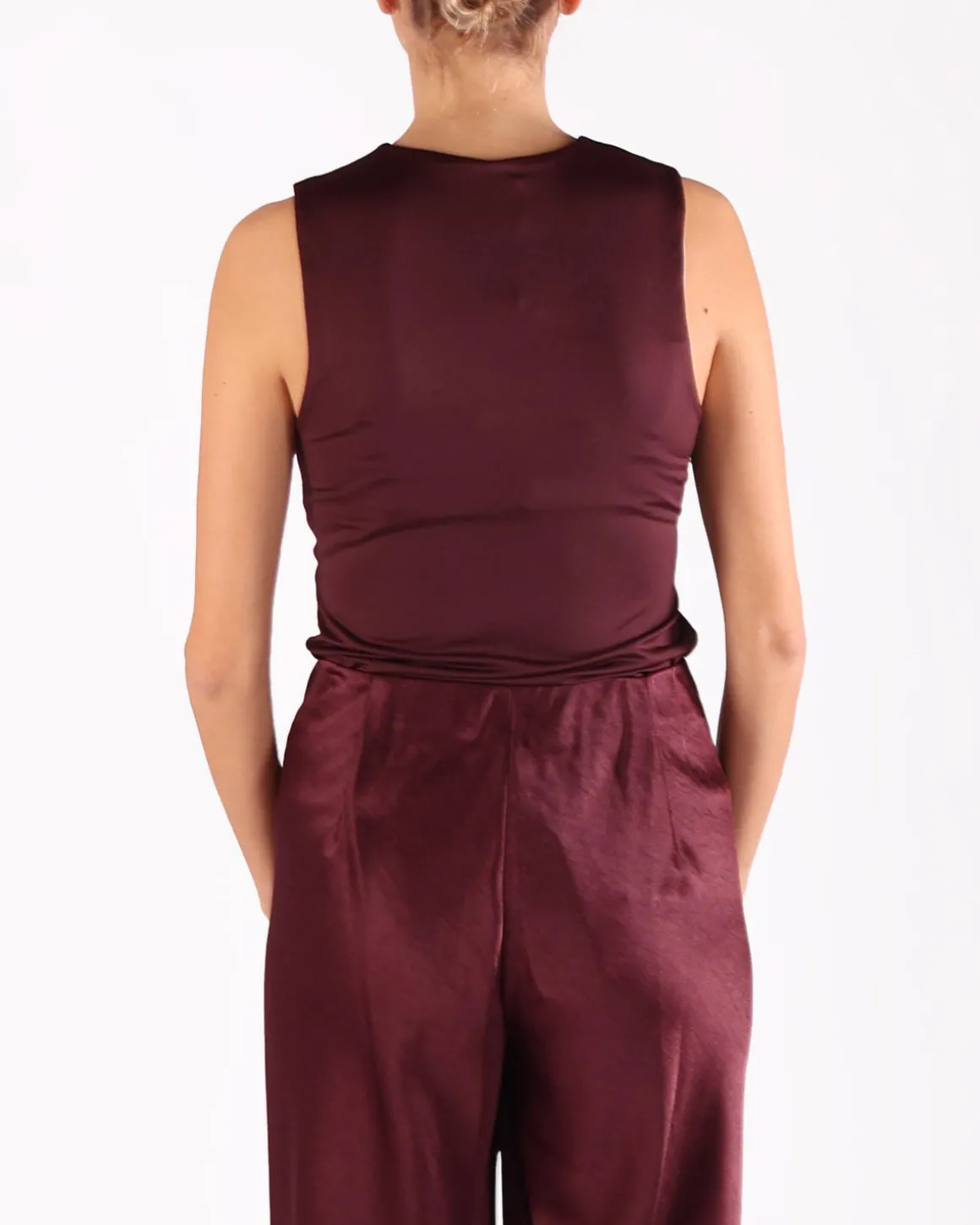 Dit bordeauxrode, mouwloze zijden topje van Vince is gemaakt van rekbaar en glanzend materiaal, wat zowel comfort als een verfijnde uitstraling biedt. De luxueuze stof valt prachtig en creëert een elegante en flatterende silhoeet. Perfect voor zowel als bovenlaag of om alleen te dragen, dit veelzijdige stuk kan moeiteloos van dag naar nacht worden gedragen en voegt een verfijnde touch toe aan je garderobe.