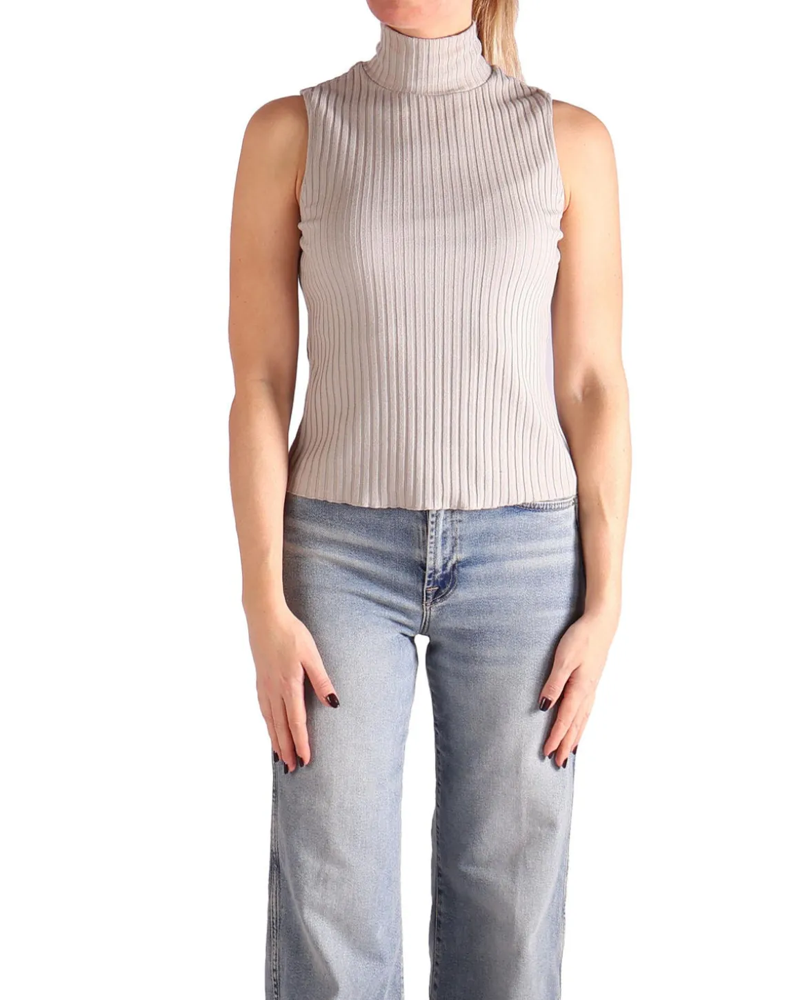 Deze ribgebreide mouwloze top van Vince heeft een elegante turtleneck, die zowel comfort als stijl biedt in een veelzijdige, lichte stof. De ribstructuur zorgt voor een verfijnde, flatterende pasvorm, perfect om te dragen als laagje of solo. Het minimalistische ontwerp straalt moeiteloze elegantie uit, geschikt voor zowel casual als meer gepolijste looks.