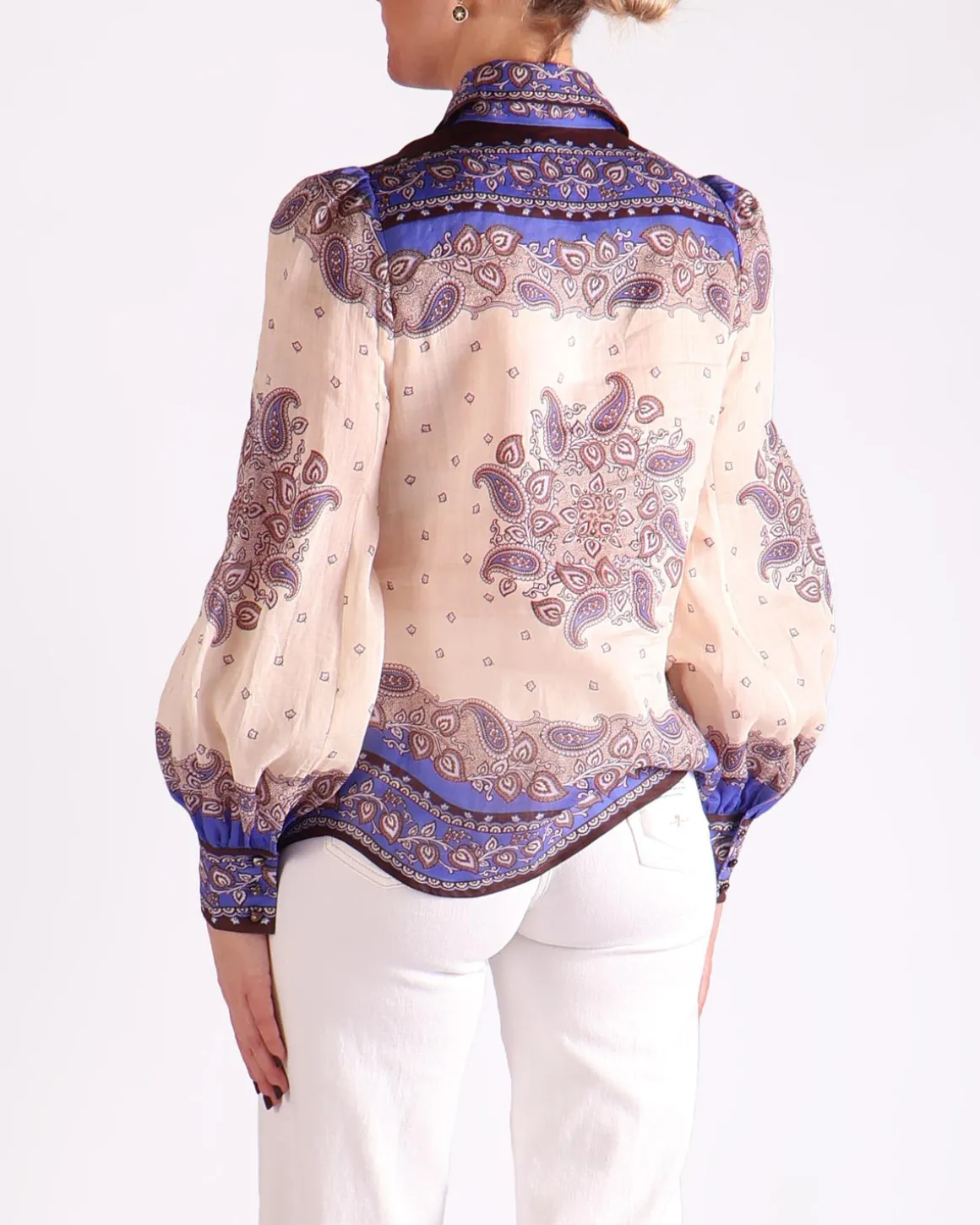 Deze paarse Zimmermann blouse heeft verfijnde paisleydetails, die een bohemien charme toevoegen aan het elegante ontwerp. De rijke paarse kleur komt prachtig tot zijn recht in combinatie met de delicate paisleypatronen, waardoor een levendige maar toch verfijnde uitstraling ontstaat. Dankzij de lichte stof en flatterende pasvorm combineert deze blouse comfort met stijl, ideaal voor zowel casual als meer geklede gelegenheden.