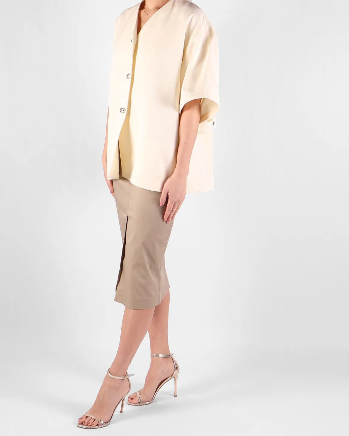 Deze olijfgroene knielange kokerrok van Access brand heeft een strakke, figuurvormende pasvorm met een moderne twist. De elastische tailleband zorgt voor comfort, terwijl de voorknoopsluiting zowel stijl als gemak biedt. De voorkant heeft een slit, wat de rok een gedurfde uitstraling geeft. Deze rok is veelzijdig en geschikt voor zowel professionele als casual gelegenheden. De neutrale olijfgroene kleur maakt het gemakkelijk om de rok te combineren met verschillende tops, voor eindeloze outfitmogelijkheden.
