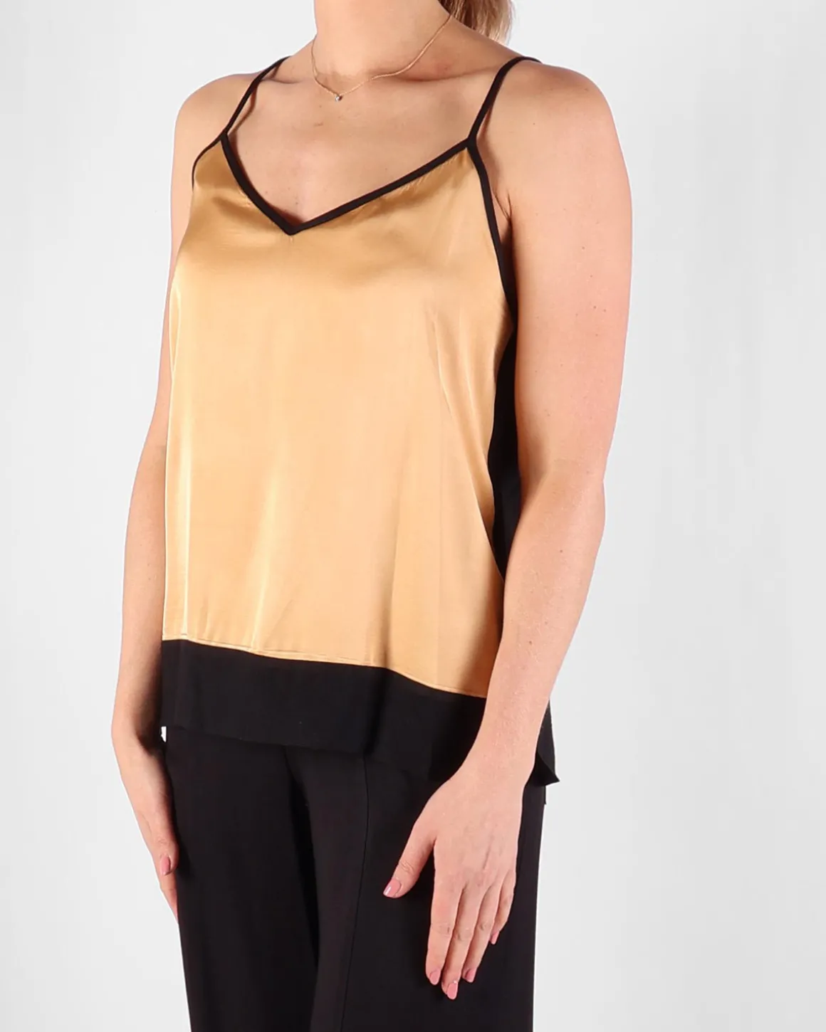 Deze top met bandjes van Access brand heeft een gedurfde uitstraling met een gouden voorkant en een zwarte achterkant, wat zorgt voor een opvallend contrast. De bandjes voegen een subtiele touch toe aan de moderne silhouet, terwijl de kleurcombinatie een edgy, maar verfijnde vibe geeft. Gemaakt van hoogwaardige stof, is het zowel comfortabel als veelzijdig, ideaal voor zowel casual als meer geklede gelegenheden. Het eenvoudige maar chique ontwerp maakt het gemakkelijk te combineren met verschillende onderstukken voor een verzorgde look.
