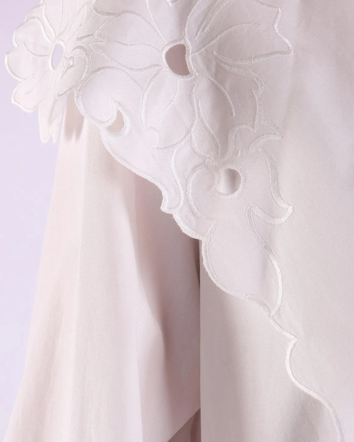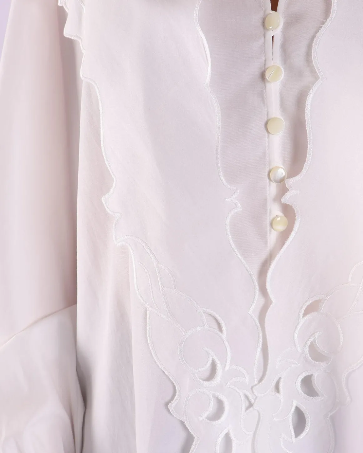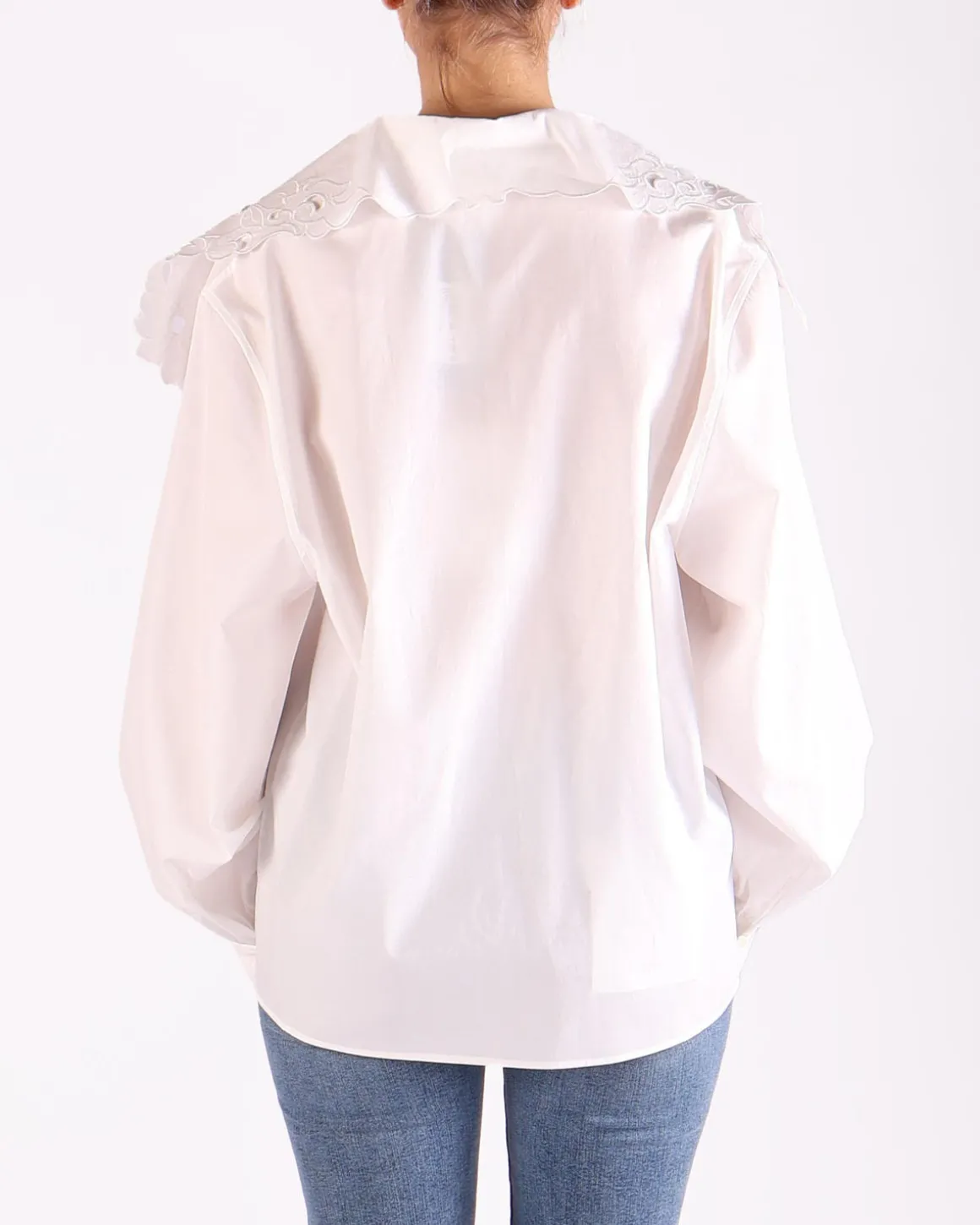Dit witte shirt heeft verfijnde cutwork-details op de kraag en ballonmouwen, wat het een vleugje vrouwelijkheid en elegantie geeft. Gemaakt van hoogwaardige stof, biedt het zowel comfort als stijl, perfect voor zowel casual als semi-formele gelegenheden. Het tijdloze ontwerp en de delicate details maken het een veelzijdige toevoeging aan elke garderobe.