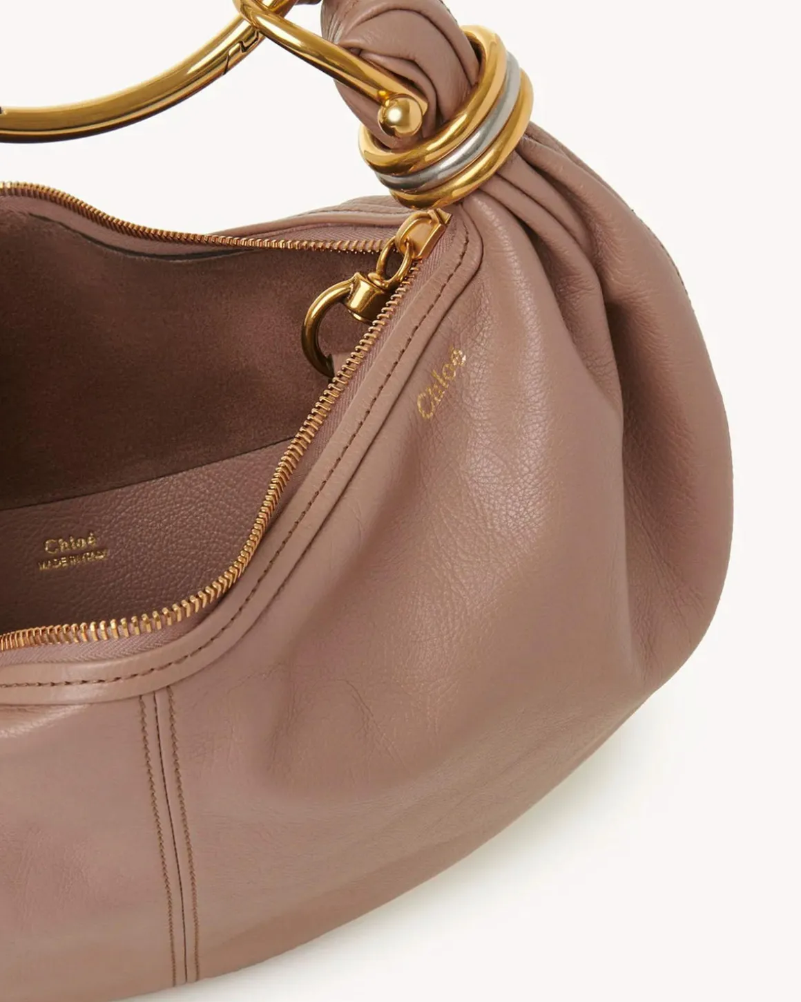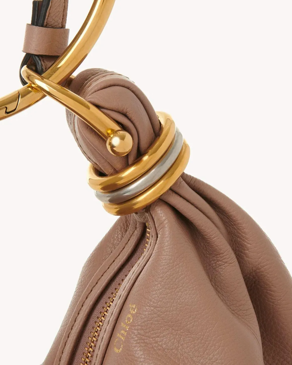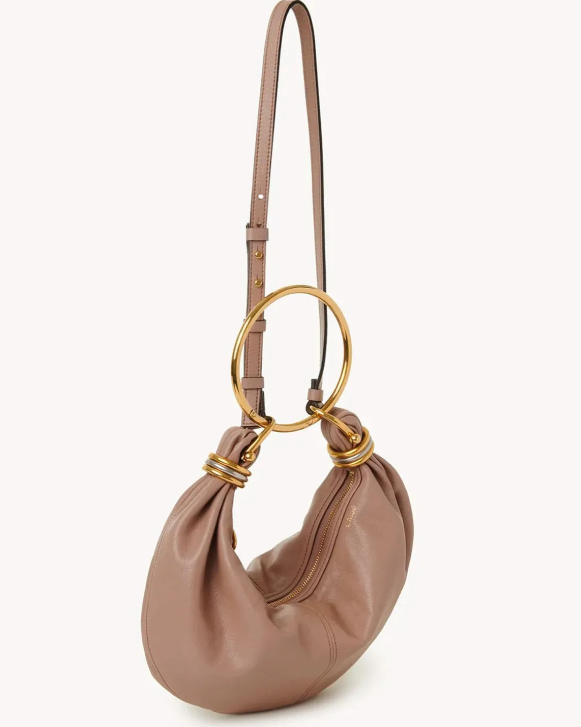 Deze taupekleurige Chloé Bracelet Hobo Bag is gemaakt van luxueus glanzend kalfsleer en heeft een soepel, rond design. Het chique armbandhandvat en de gestapelde bi-color ringen geven een moderne, verfijnde uitstraling. Een perfecte accessoire om elke outfit een tijdloze elegantie te geven.