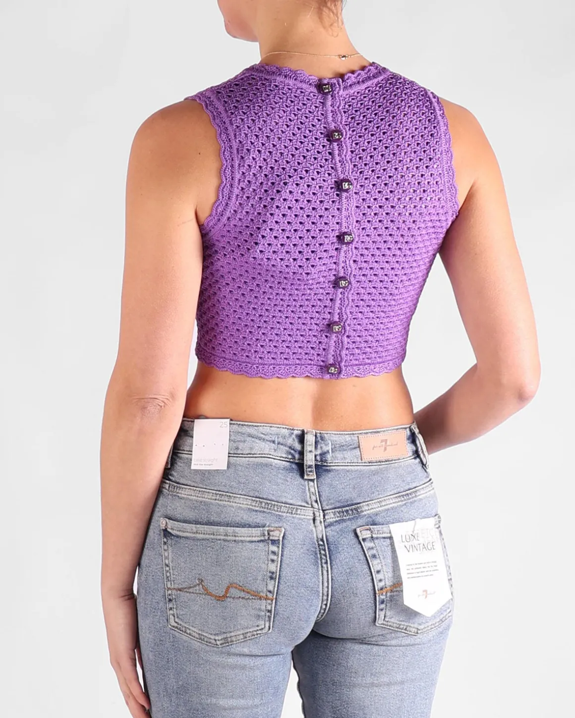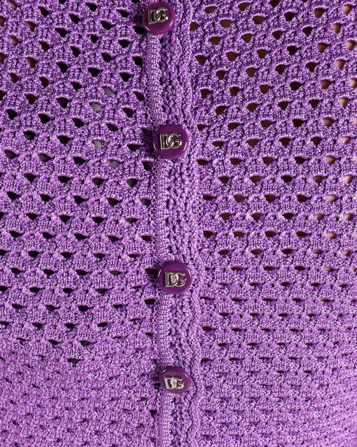 Dit paarse gebreide topje van Dolce & Gabbana heeft een unieke combinatie van texturen, die diepte en interesse toevoegt aan het chique, korte, mouwloze ontwerp. Gemaakt van hoogwaardig garen, biedt het een comfortabele en flatterende pasvorm met luxueuze details. De rijke kleur en de ingewikkelde breisteek maken het een opvallend stuk voor zowel dag- als avondlooks.