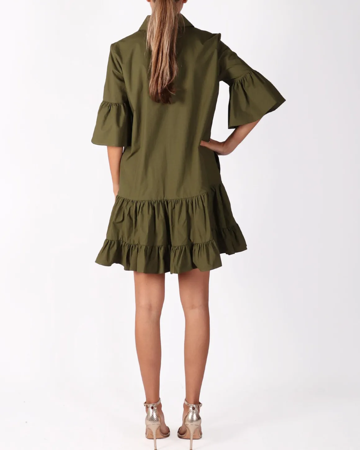 Deze korte olijfgroene jurk van DoubleJ heeft korte mouwen en een stijlvolle knoopsluiting. De jurk combineert eenvoud met elegantie, waardoor hij geschikt is voor zowel casual als meer geklede gelegenheden. Draag hem met sandalen of hakken en subtiele accessoires voor een complete look.