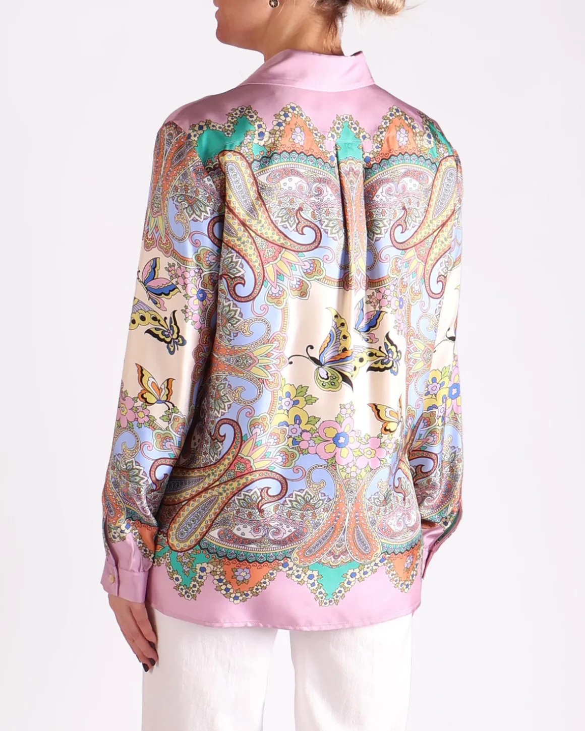 Deze ETRO blouse heeft een all-over paisleyprint op een zachte roze basis, die een levendige en eclectische uitstraling biedt. Het rijke patroon komt mooi tot zijn recht tegen de vrouwelijke roze achtergrond, waardoor het een stijlvolle statement-piece is. Met de ontspannen pasvorm en luxe stof is deze blouse zowel comfortabel als elegant, perfect voor verschillende gelegenheden.