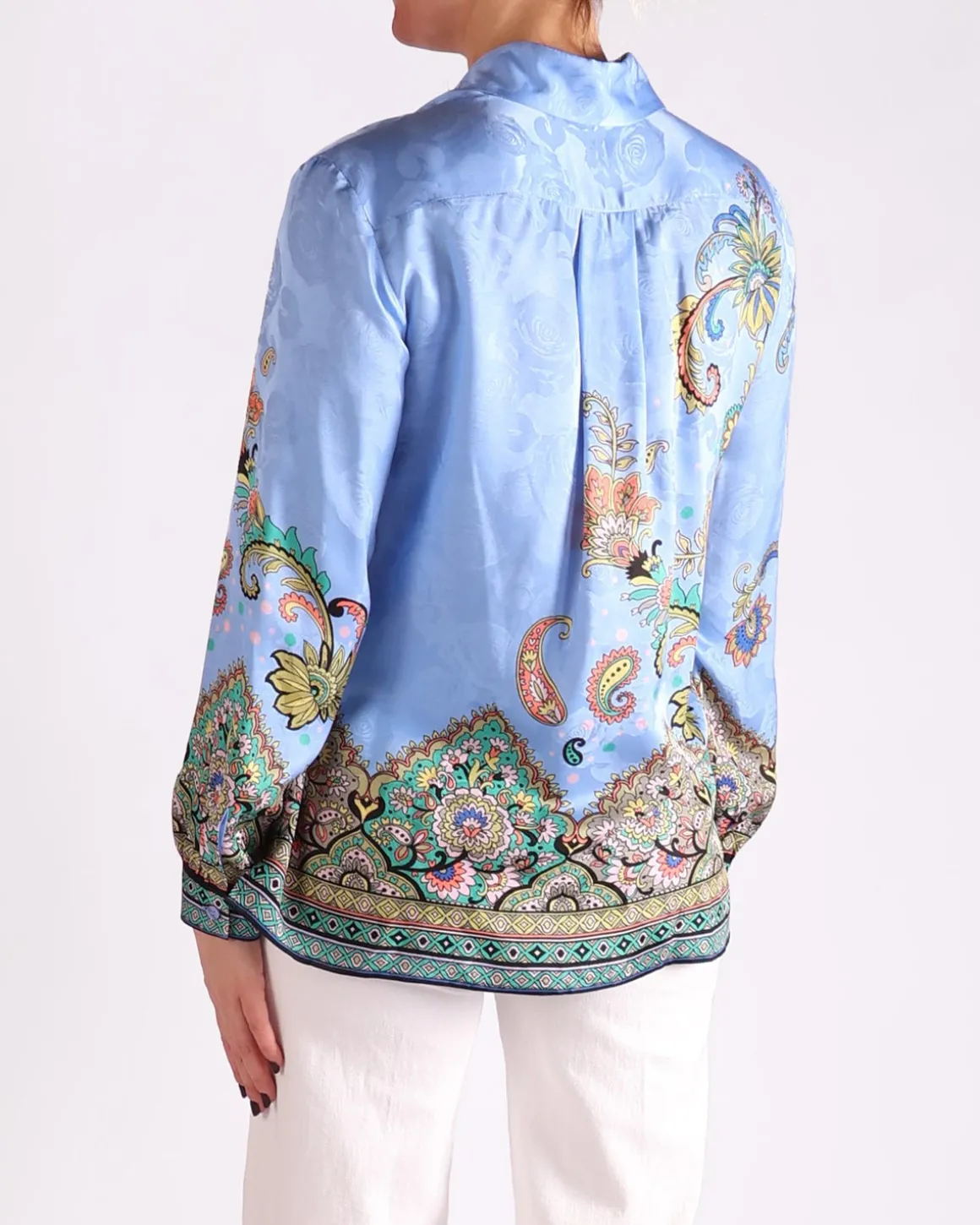 Deze ETRO blouse heeft een all-over paisleyprint op een zachte blauwe basis, wat een levendige en eclectische uitstraling biedt. Het rijke patroon komt prachtig tot zijn recht tegen de frisse blauwe achtergrond, waardoor het een stijlvolle statement-piece is. Met de ontspannen pasvorm en luxueuze stof combineert deze blouse comfort en elegantie, perfect voor verschillende gelegenheden.